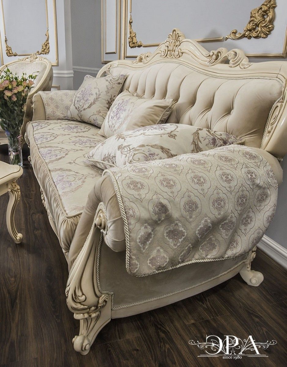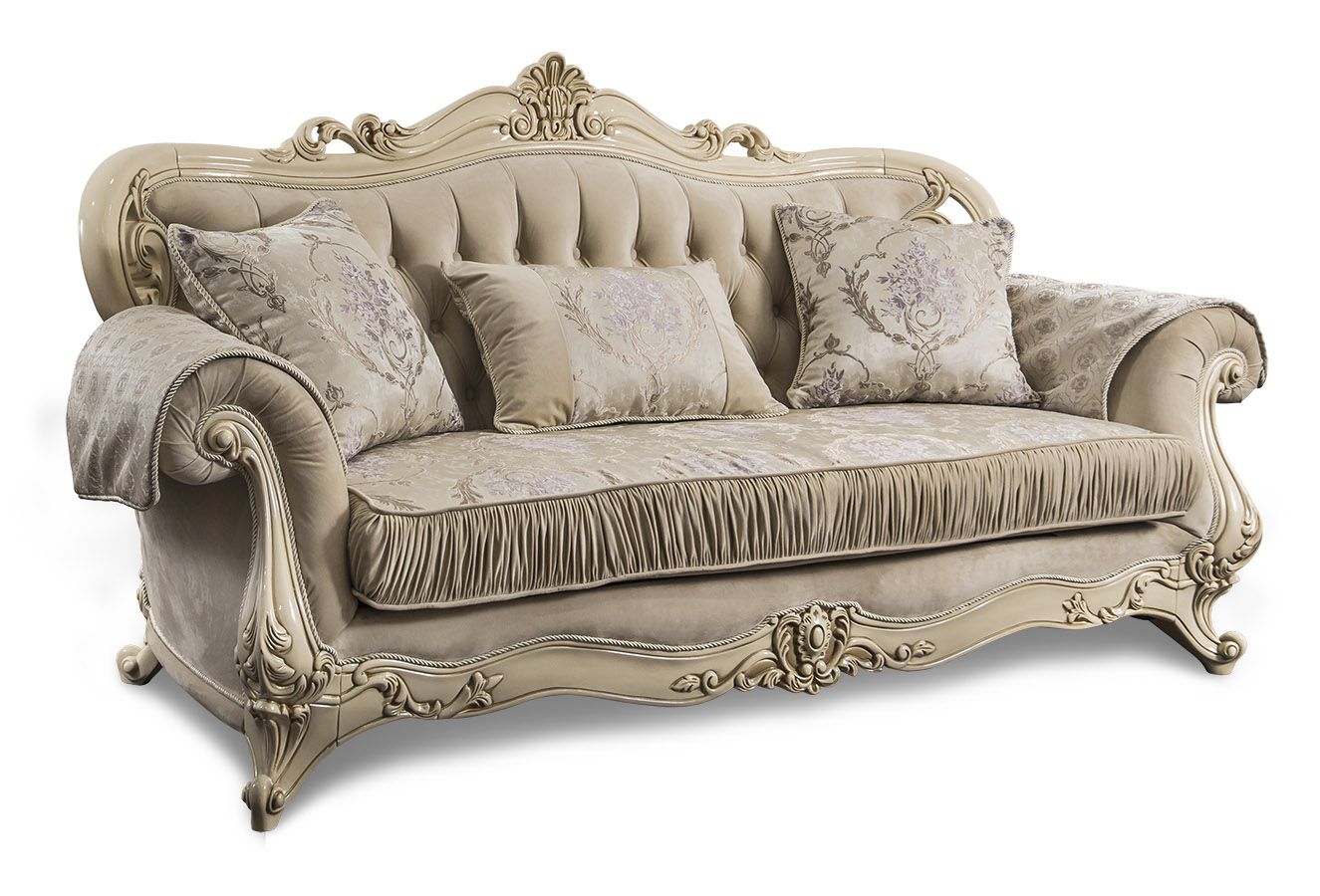 Поверхность 3-х местного дивана «Мона Лиза» обтянута тканью велюр и жаккард в нежном кремовом цвете. Особое очарование ему придает красивая оборка по низу изделия и каретная стяжка на спинке. Широкие мебельные шляпки придадут отделке премиальный вид, и повысят ее стойкость к износу.