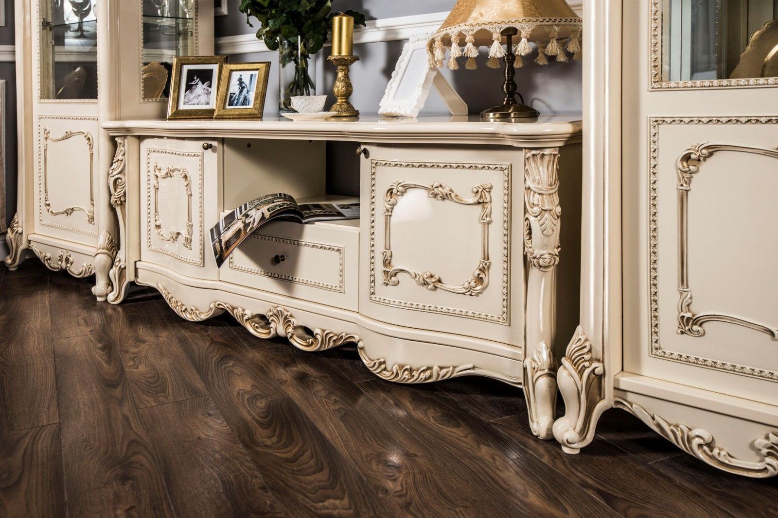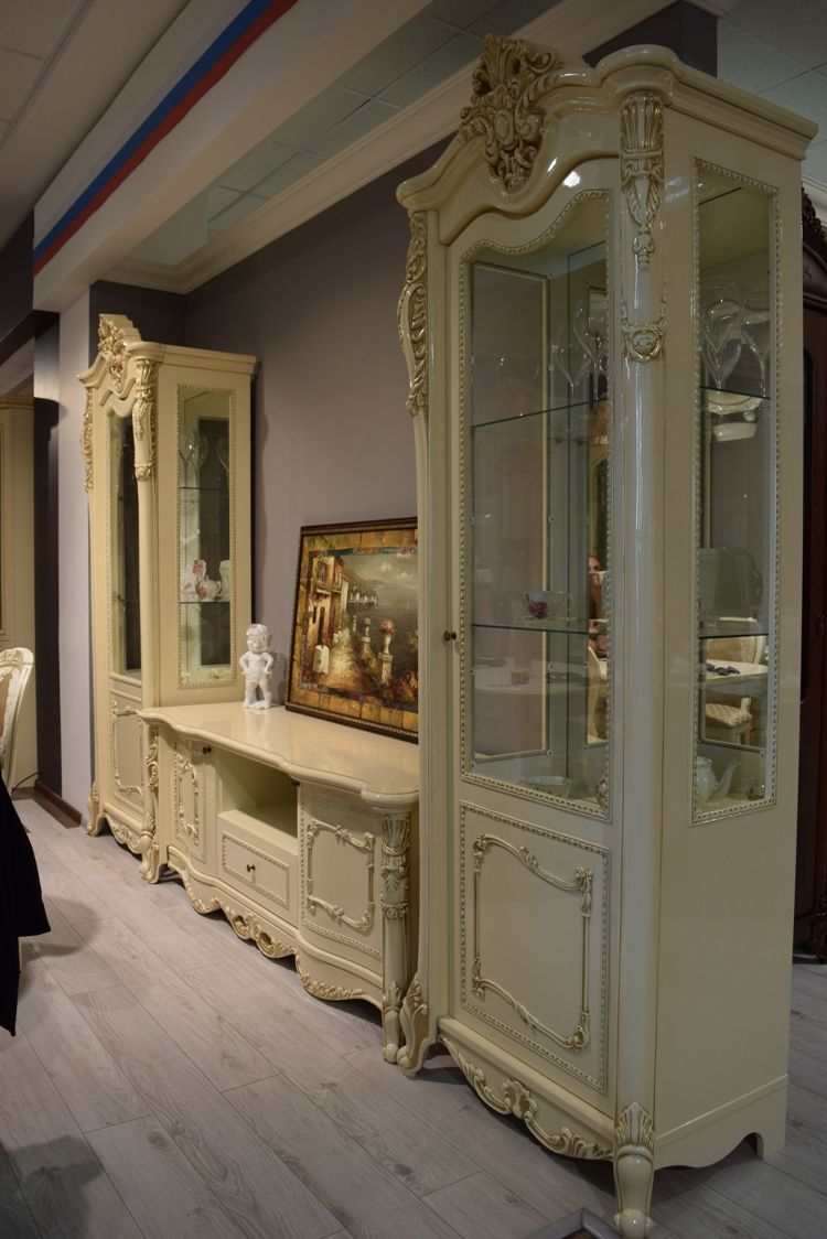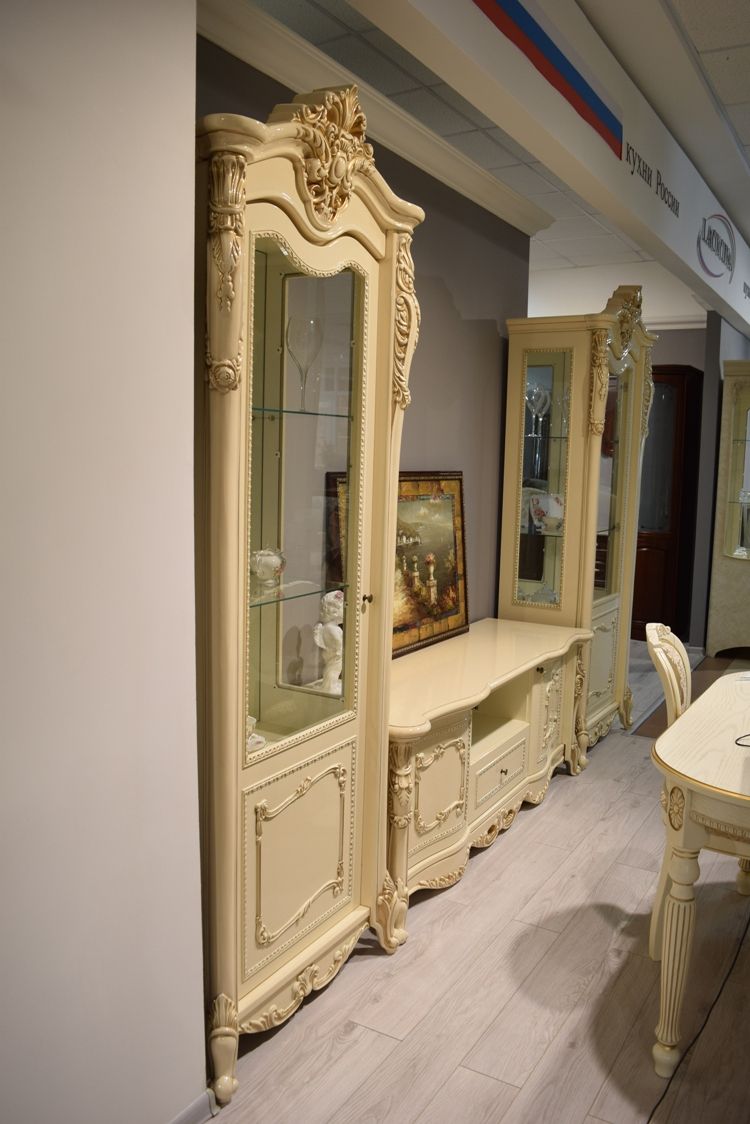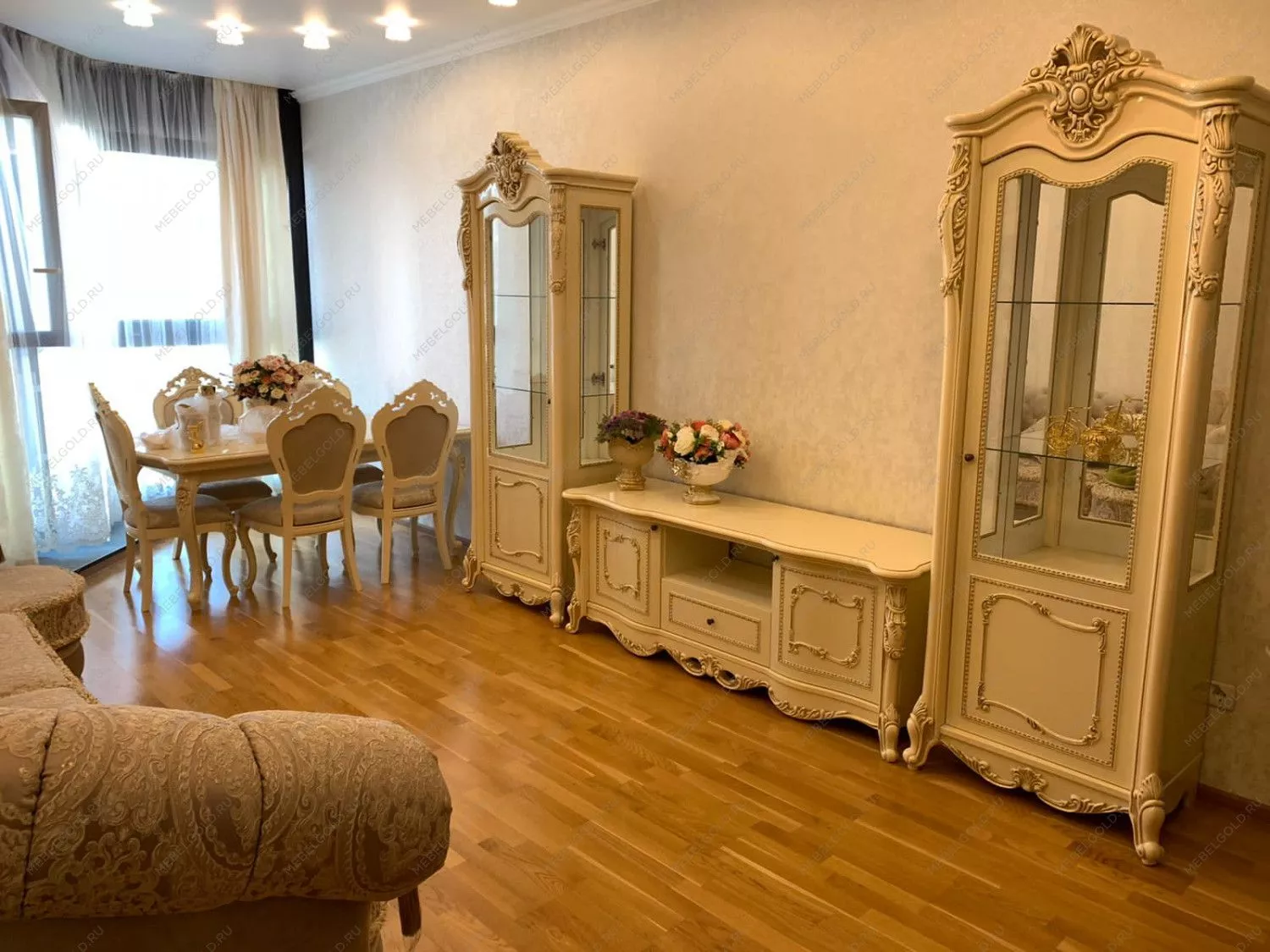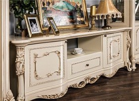 В основе изготовления гостиной «Джоконда» крем глянец лежат изящные линии четко очерченного карандаша, объемные узоры с обилием завитков и позолоты. Большое внимание уделяется скругленным элементам. Уютная, нежная, по-домашнему приветливая – такой получилась гостевая мебель, результат кропотливых трудов российских дизайнеров. В ней доминирует изыск и тепло, преобладает обилие воздуха и красивых текстур. Каждый предмет напоминает антиквариат с потертостями и плавными линиями. В отделке применяется ручная роспись и золочение.