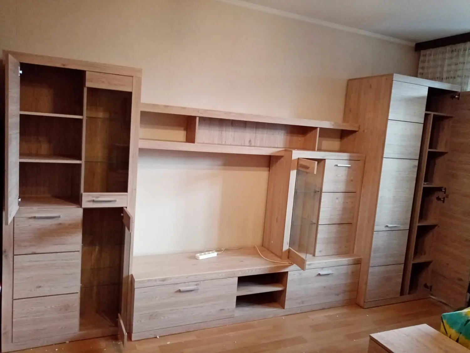 В интерьере гостиная смотрится стильно и современно, не громоздко. Шкафчики и полки глубокие и вместительные, ручки максимально удобные. Рисунок поверхности красивый, не блеклый. Обязательно обратимся в ваш магазин еще и за спальней!