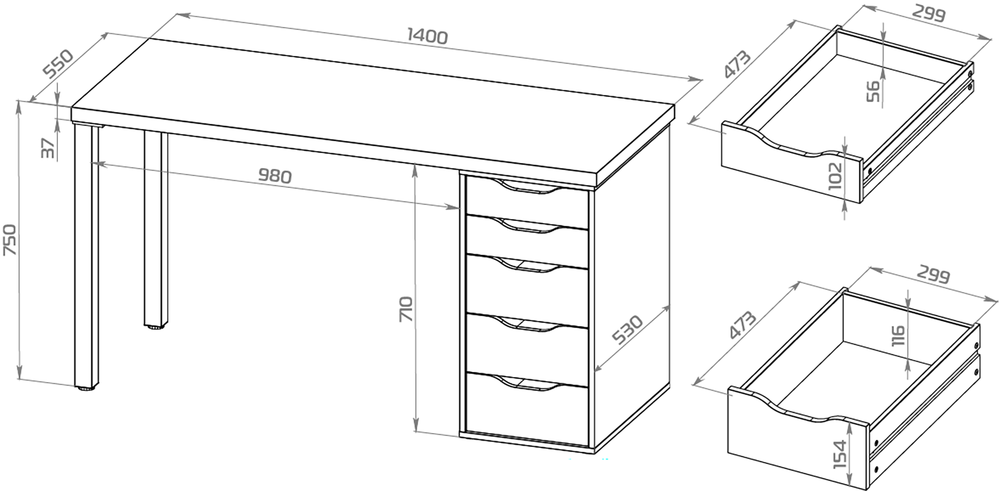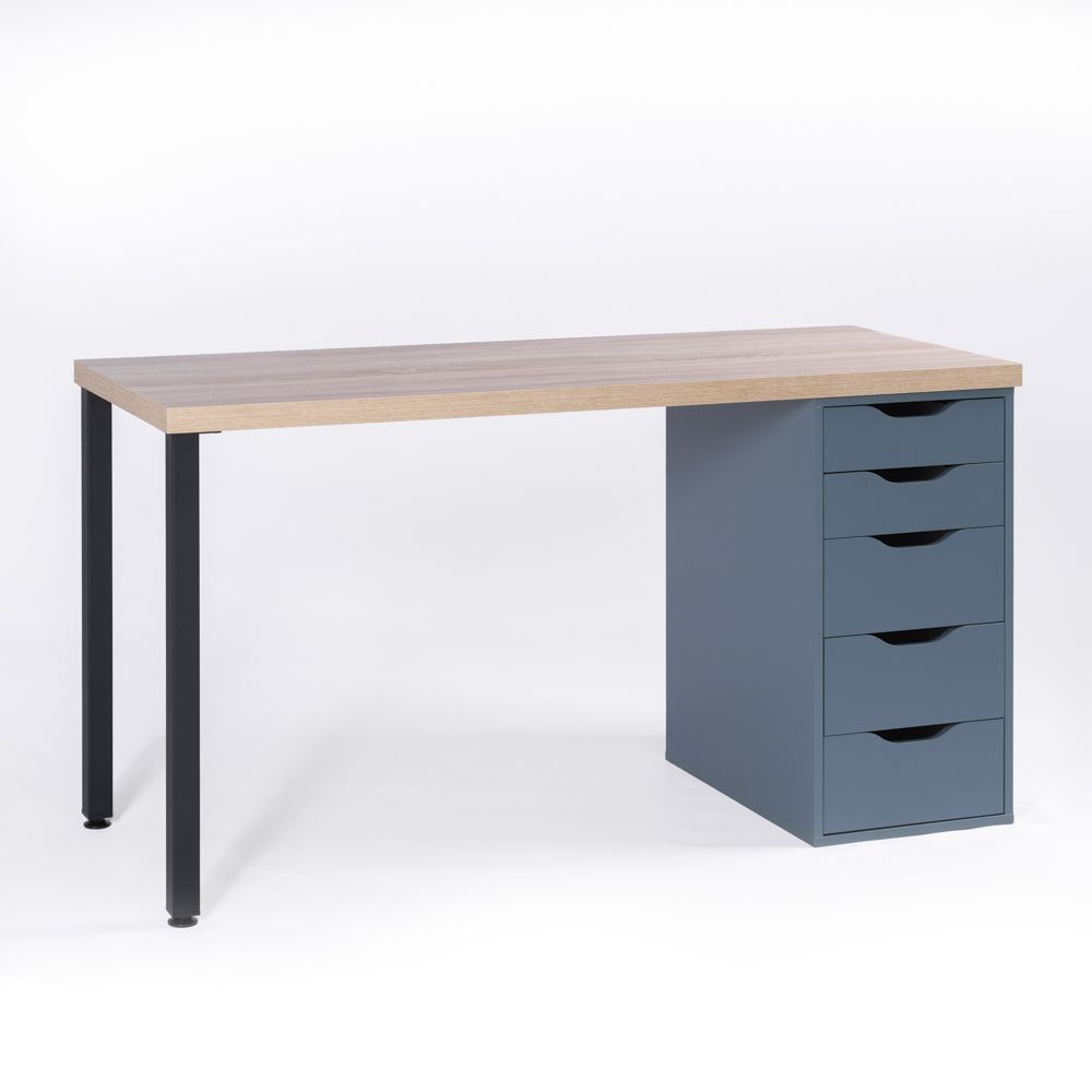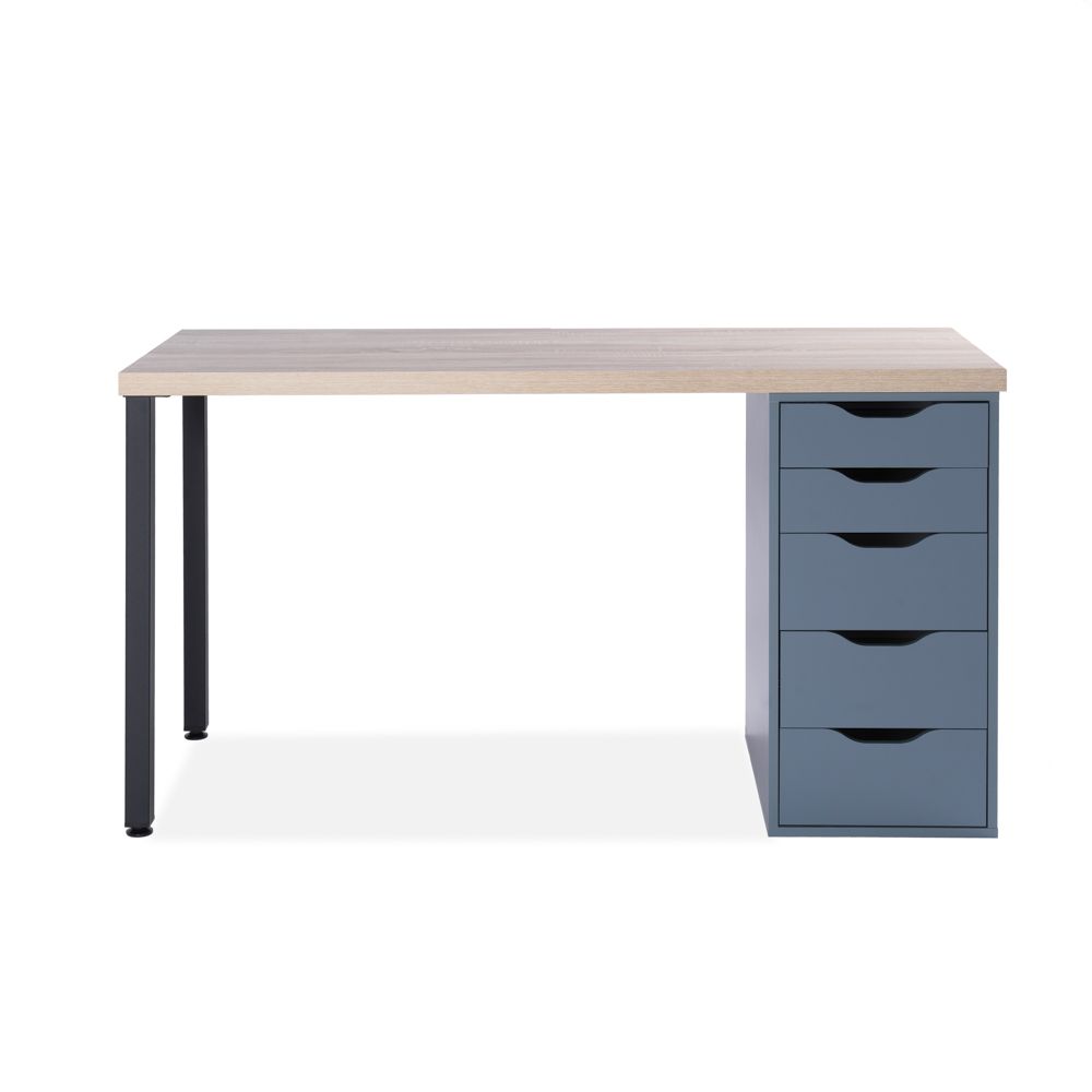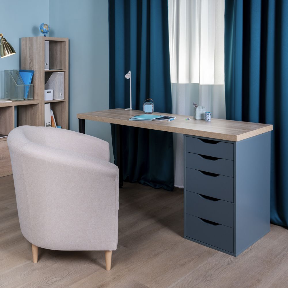 Стол письменный Ингар 2/5Т, 140x75x55, цвет Дуб беленый/серо-бирюзовый/черный. Стол комплектуется столешницей, двумя металлическими ножками и тумбой под столешницу с пятью выдвижными ящиками. Конструкция столешницы - тамбурат (рамка из ДСП и HDF с сотовым заполнением) - популярная современная технология, активно внедряемая крупнейшими производителями для изготовления мебели по скандинавским стандартам. Ножки - крашенный металл в черный цвет. Опоры ножек регулируемые. Конструкция тумб стола: ДСП, поверхность, декорированная бумага, окраска УФ материалами. Фасады ящиков без ручек, с вырезами для удобного выдвижения. Ящики переменной высоты позволяют использовать их для хранения разнообразных предметов.Преимущества: облегченная конструкция (тамбурат); высокая прочность, устойчивость; простая, быстрая сборка; эстетичный внешний вид. Гарантийный срок для жилых и общественных помещений 24 месяца.