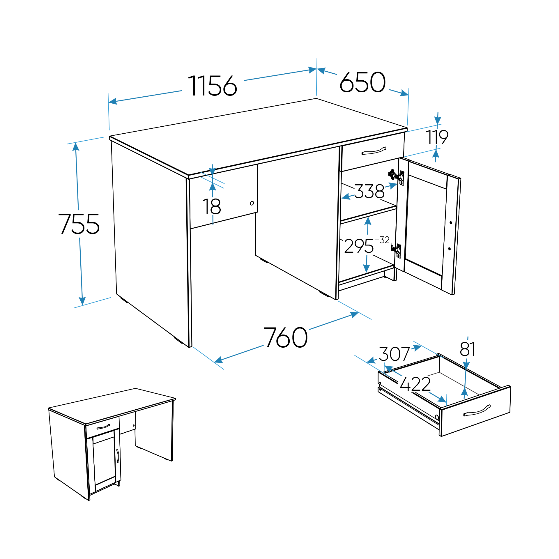 Стол письменный КАСТОР с тумбой и наружным выдвижным ящиком, 1156х650х750, цвет Серый. Изготовлен из кашированного ДСП толщиной 16 мм. Тумбу с ящиком можно разместить справа или слева под столешницей. Гарантийный срок для жилых помещений 24 месяца, для общественных помещений - 18 месяцев.