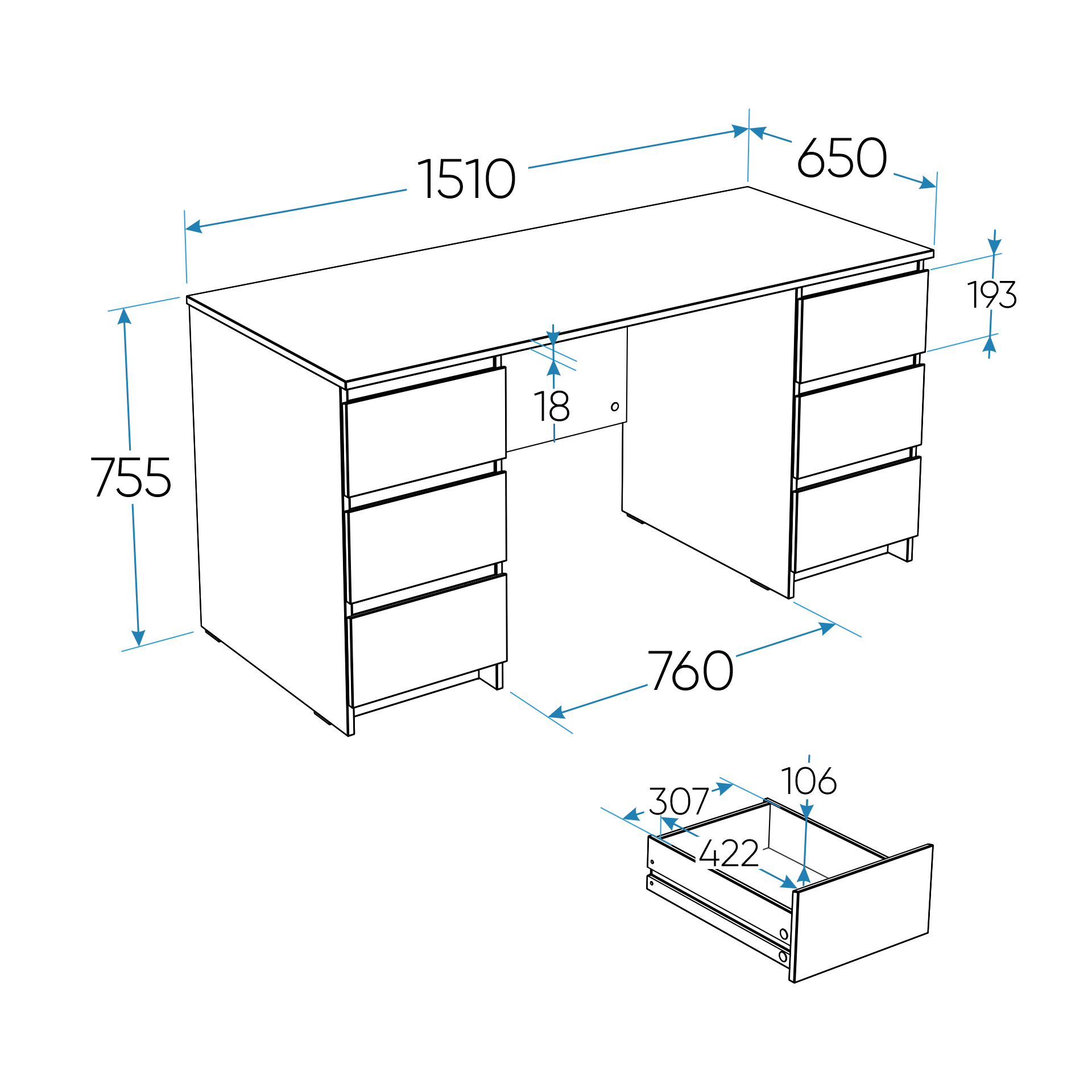 Стол письменный КАСТОР с двумя рядами наружных выдвижных ящиков, 1510х650х750, цвет Серый. Изготовлен из кашированного ДСП толщиной 16 мм. Гарантийный срок для жилых помещений 24 месяца, для общественных помещений - 18 месяцев.
