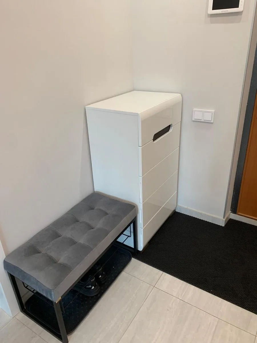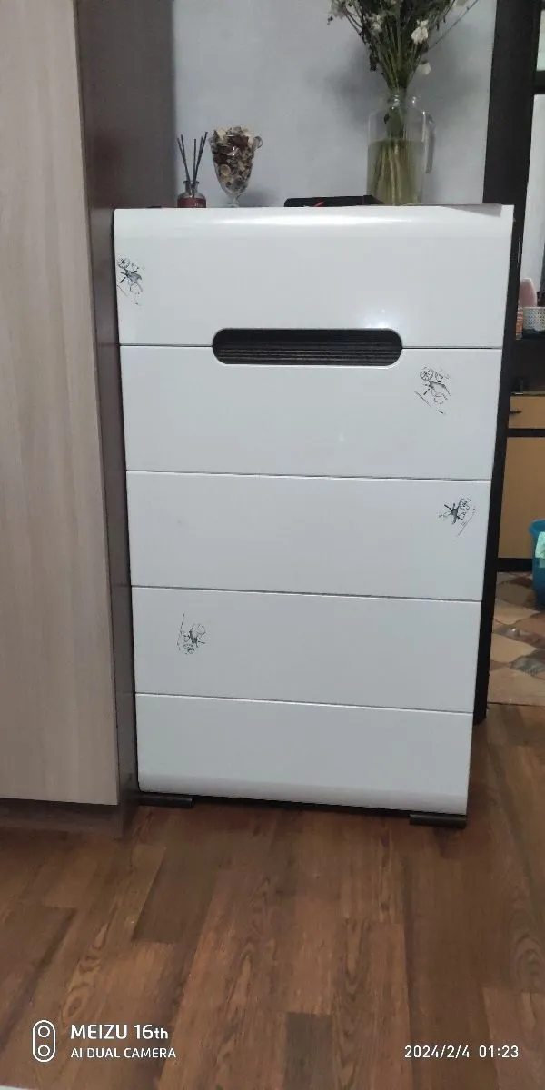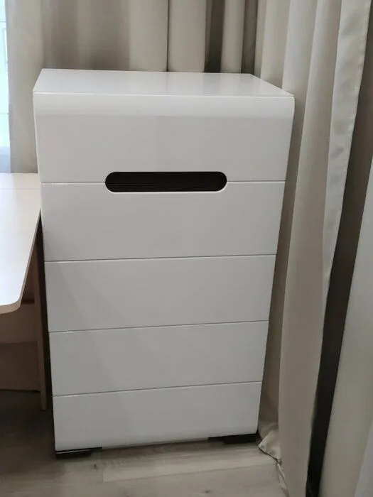 Комод очень красивый. Белый глянец смотрится дорого. Собрала сама по инструкции, хотя опыта у меня нет. Всё дырочки для крепёжных деталей на своих местах. Фурнитура подобрана отлично. Задняя стенка идеально входит в специальные пазы. Под днищем ящиков специальные железочки, чтобы дно не прогибалось. Всё ящики стали идеально параллельно друг другу, кроме одного, но и на этот случай всё продумано. На детальке есть специальное колесико, которым можно подрегулировать ящики. Единственный минус для меня, ящики так прикручены, что их не вытащить, но в процессе эксплуатации это оказалось вроде и не нужно.
