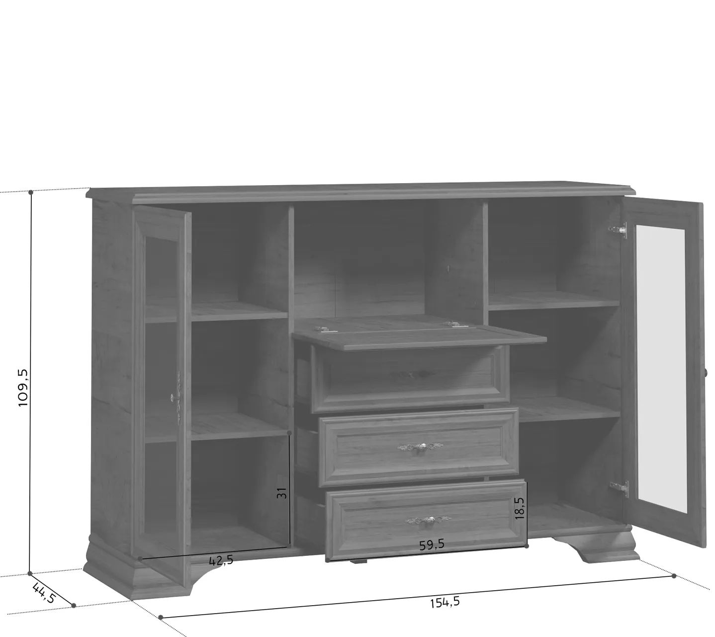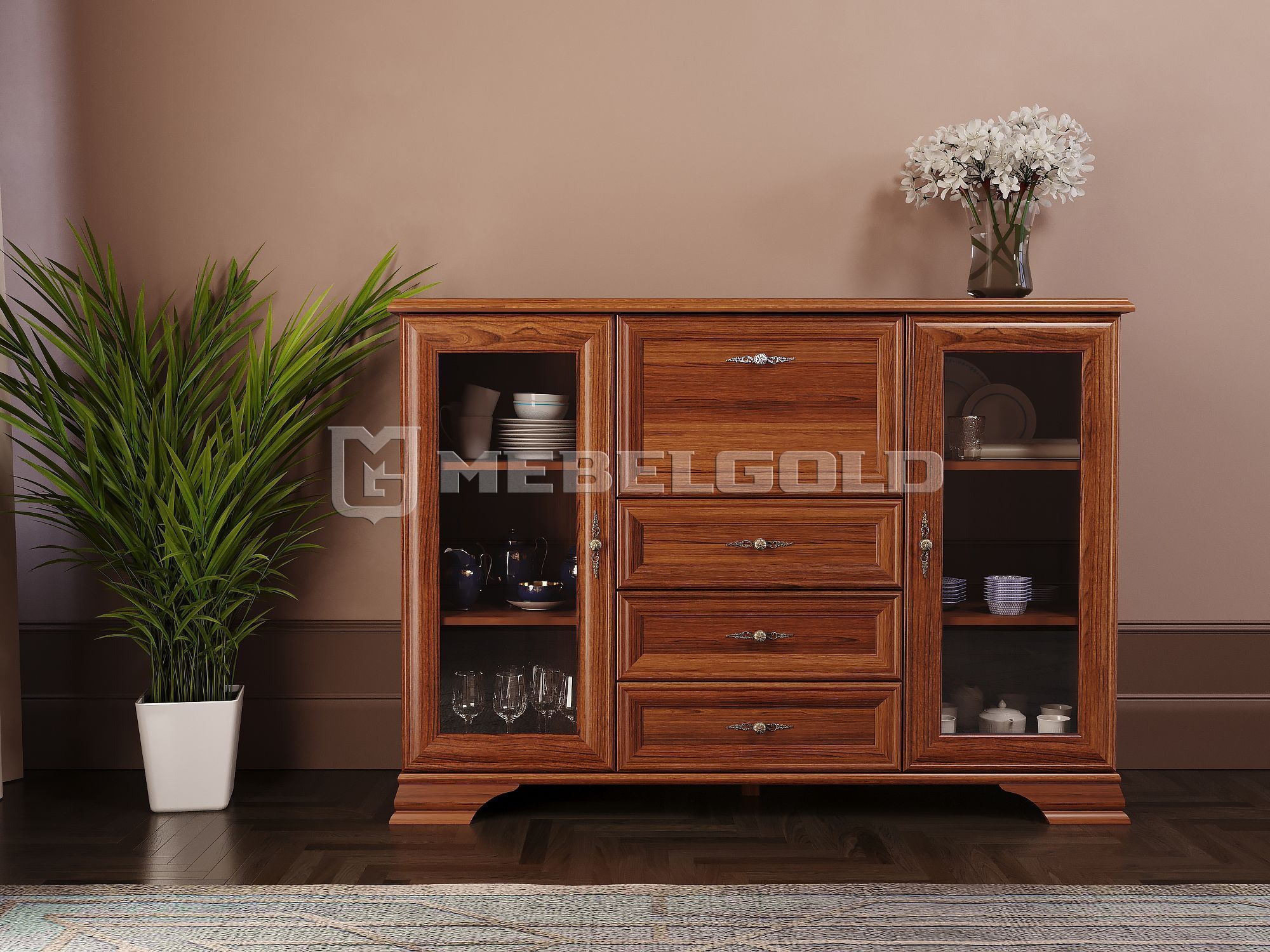 По сравнению с комодом линейки Kentaki каштан тумба отличается большей вместительностью и гармоничным видом. Это модель с расширенным объемом функций, в которой кроме трех выдвижных ящиков есть одно отделение и две распашные двери с полками внутри. Она легко заменит витрину и позволит хранить за стеклом красивые сервизы и сувениры, а за откидной створкой – организовать настоящий бар с изысканным алкоголем.