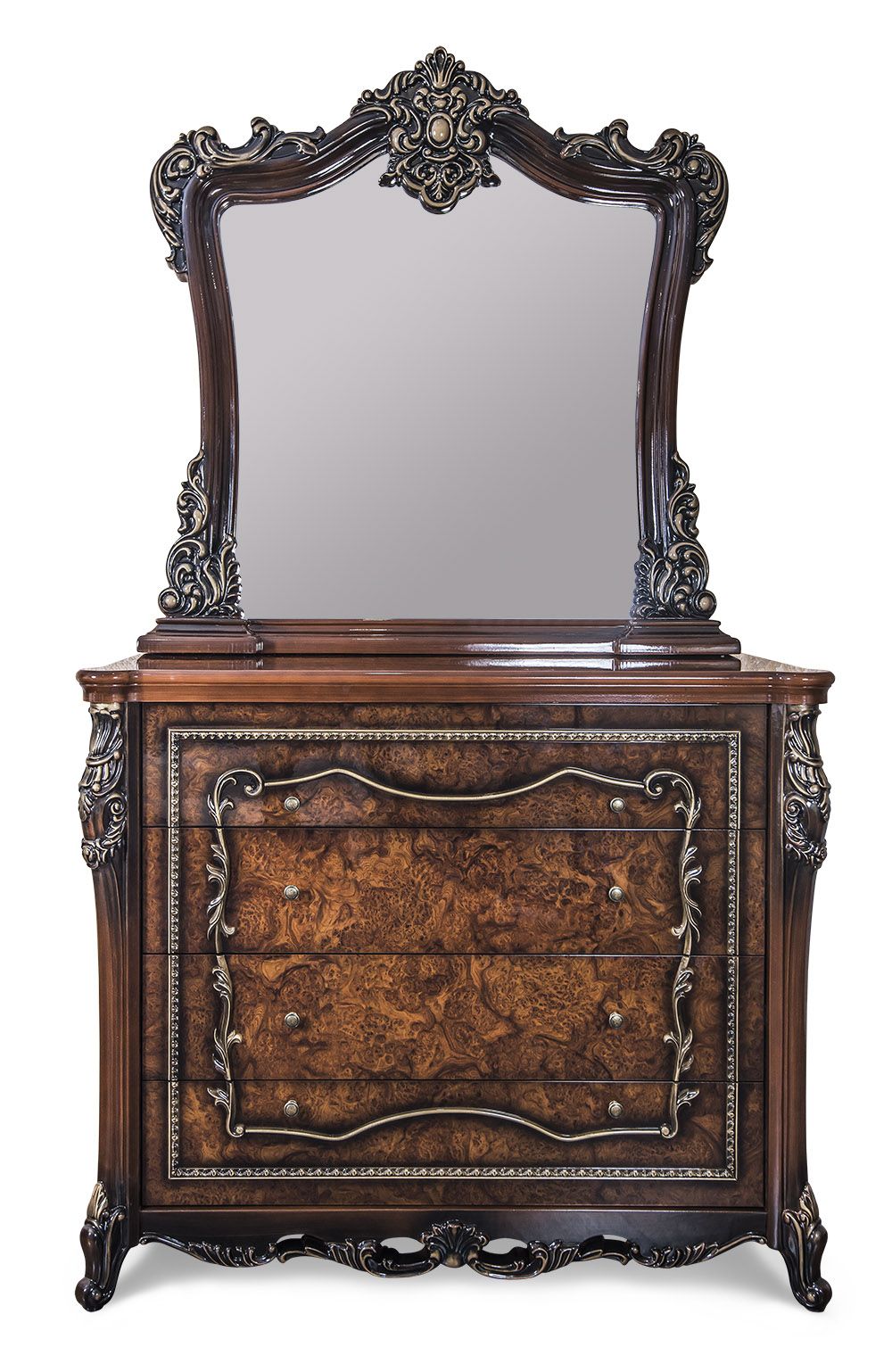 Шикарный комод «Джоконда» в цвете корень дуба глянец – отличный выбор для спальни классического стиля. С первого взгляда эта модель привлекает элегантной фрезеровкой МДФ и богатым декором с эффектом золочения. Такое изделие изготовлено из ЛДСП Kronospan толщиной 16 мм, а при производстве узоров накладок используется облегченный материал премиум сегмента ППУ. Его отличает высокая влагостойкость и ударопрочность.