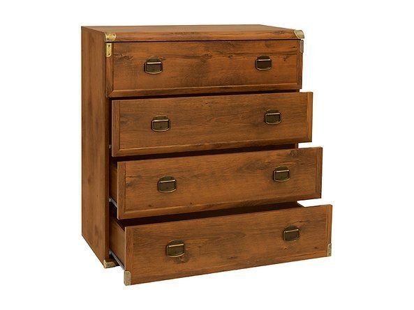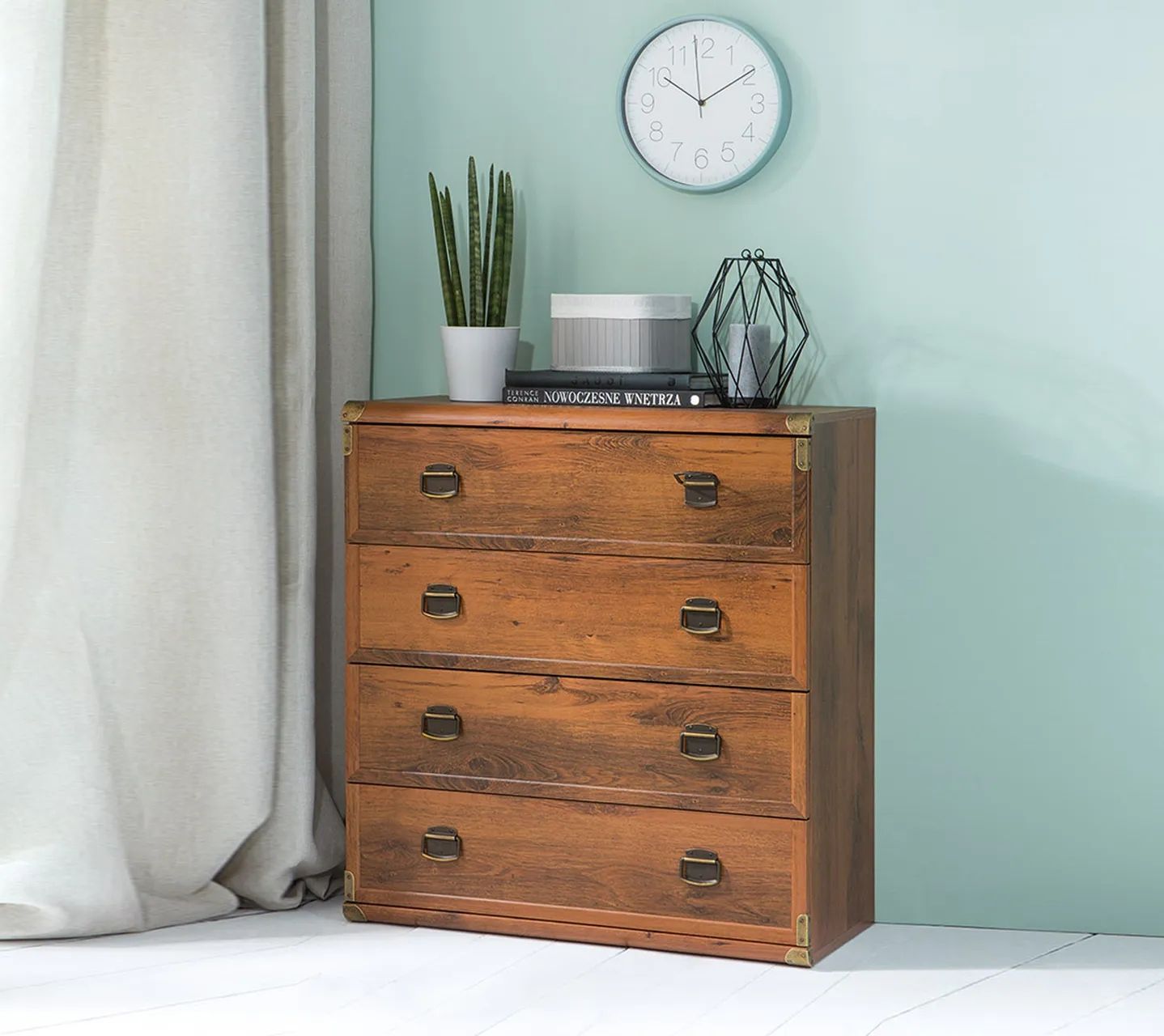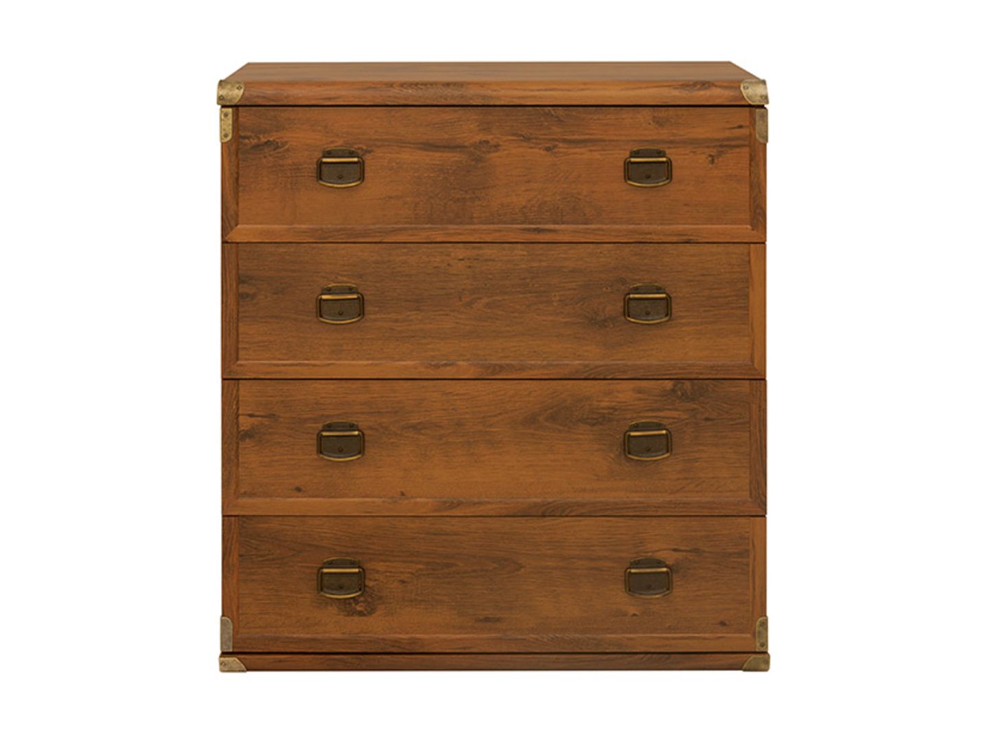 Комод высотой 87 см и шириной 80 см легко умещается в небольшое пространство. Наличие в нем четырех ящиков говорит в пользу удобства и высокой наполняемости изделия. В этих глубоких отсеках можно хранить любые вещи, от игрушек до бытовых атрибутов и белья, верхнюю часть использовать, как подставку для предметов декора или светильника. Модель идеально подходит для наполнения детских, гостиных, прихожих, оформленных в классическом стиле или кантри.