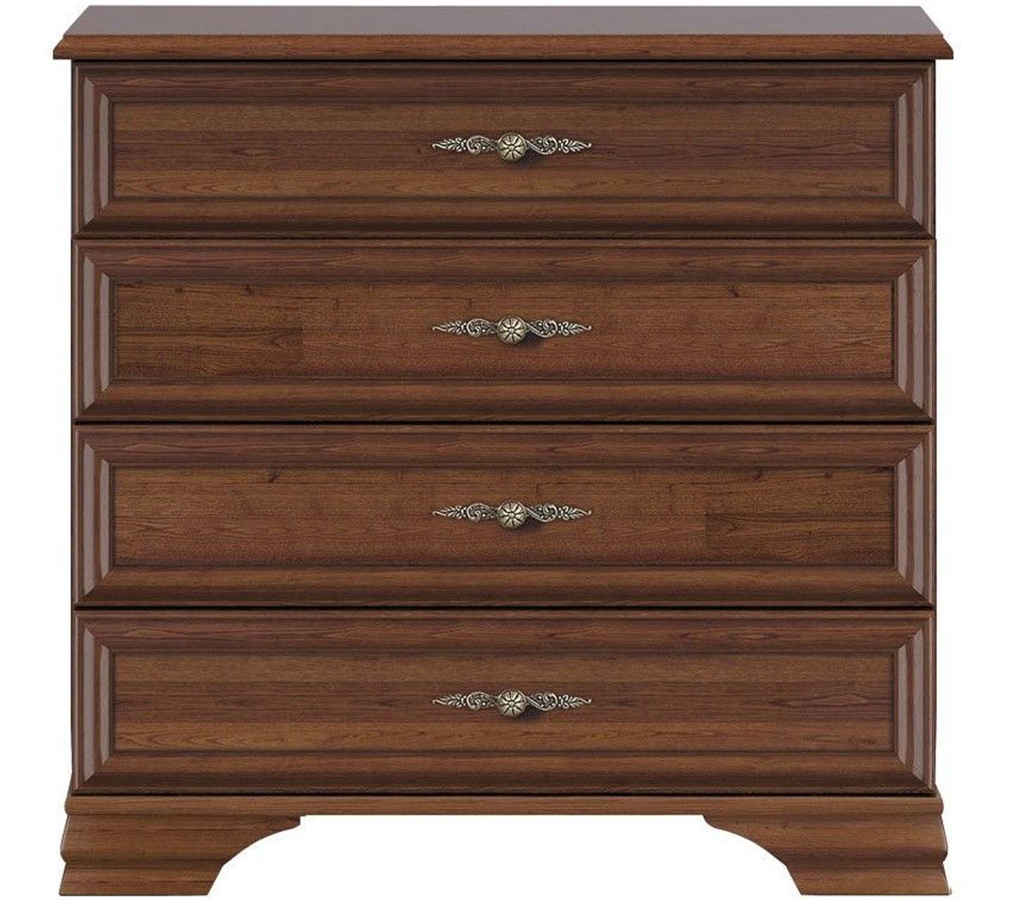 Комод коллекции Kentaki имеет широкие, устойчивые резные ножки и 4 ящика одинакового размера. В качестве декора и функционального элемента использована элегантная металлическая фурнитура. За счет высоты 90 см, ширины 94,5 см, глубины 44,5 см он вместит большой объем вещей и не загромоздит пространство.