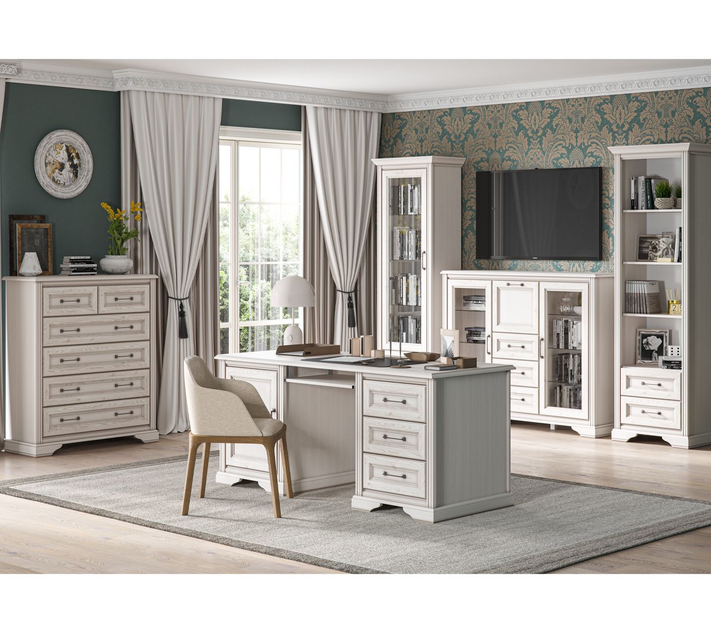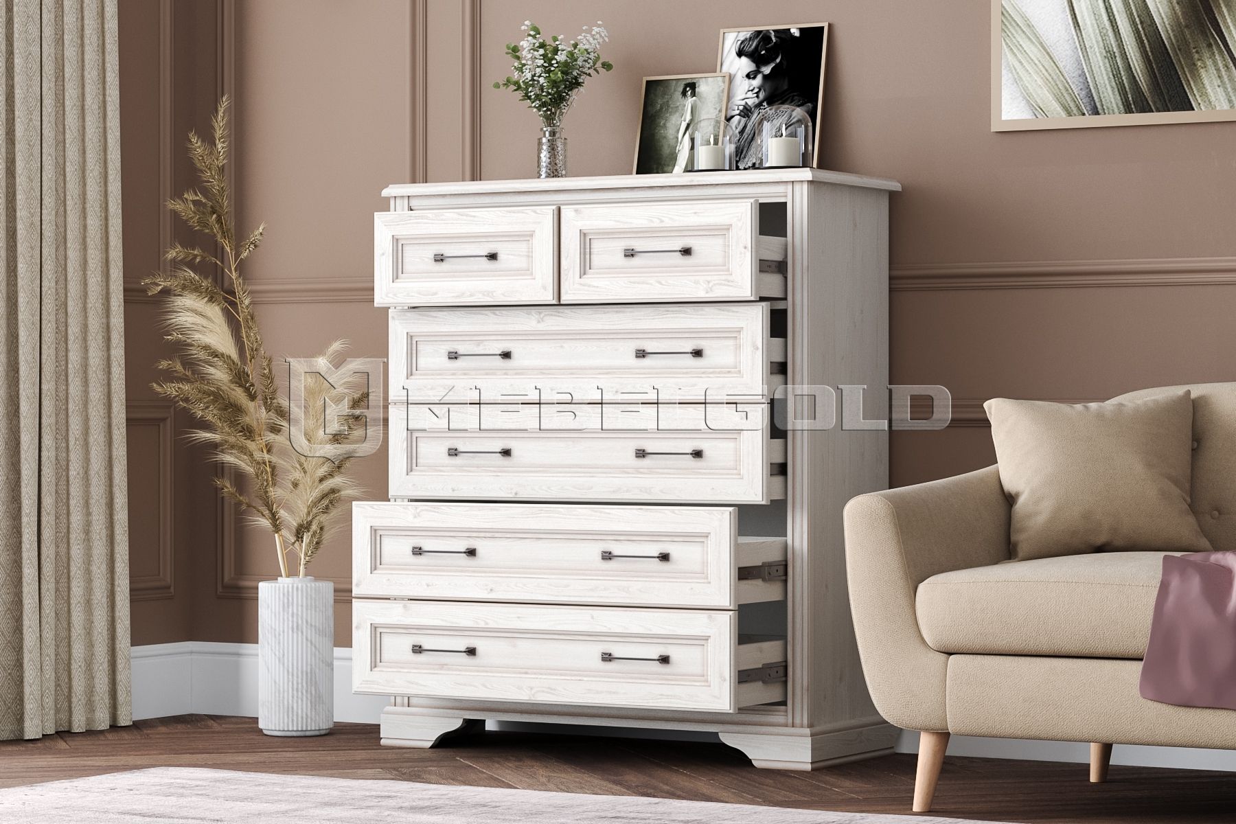 Фасады комода Stylius имеют красивый древесный рисунок с бороздками темного оттенка и красивый цвет сибирской лиственницы. При любом освещении такие поры смотрятся естественно и богато. Эта модель с резным карнизом, рифлеными ножками и филенками станет уместным решением для классических и неоклассических интерьеров. Ее поверхность можно использовать для хранения книг и ночника, ящики – для белья, игрушек и документов. Подберите к комоду другую мебель из этой коллекции, в комплекте он смотрится просто шикарно!