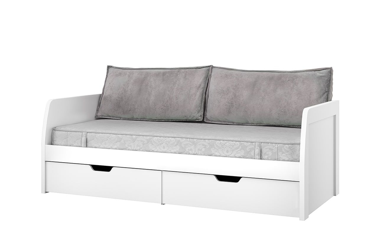 Белорусская кровать Taurus 90-2 М уверенно демонстрирует удобство спального места и дивана. Она идеально создана для детского отдыха и порядка в комнате: по всему периметру проходят бортики со скругленными углами, а внизу установлены два бельевых ящика и есть подушки. Диван-кровать «Таурус» с размером спального места 90×200 см предназначен для одного ребенка с массой тела не более 90 кг. Он имеет каркас из ЛДСП и жесткое крепление каждого элемента, в результате чего эта модель приобретает устойчивость и прочность.