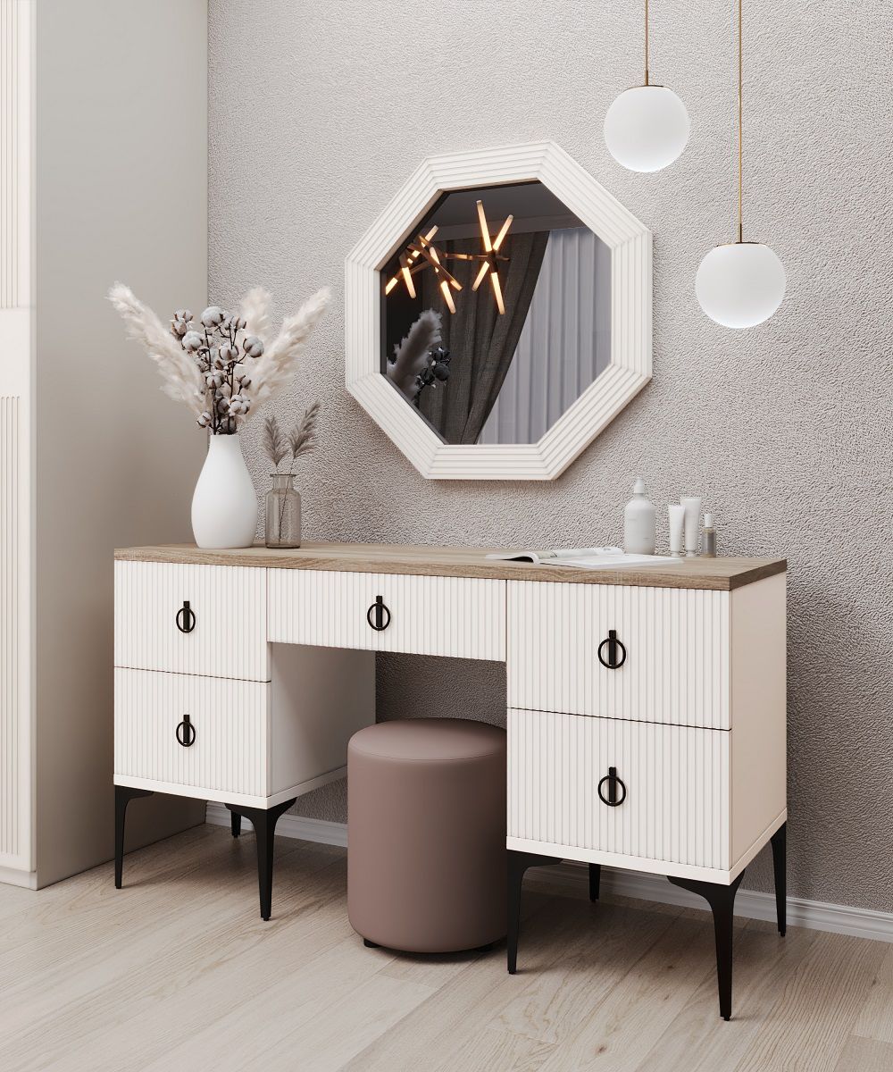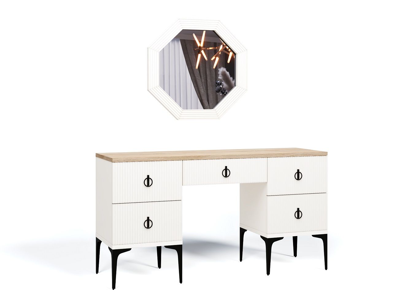 Туалетный стол "Стелла" придает интерьеру особый современный шарм. Просторная столешница и удобные выдвижные ящики, оснащенные доводчиками, обеспечивают максимальную функциональность и комфорт в вашей спальне такой столик можно использовать как косметический в паре с зеркалом, так и  как рабочий стол для студента или школьника. Мягкий стильный пуф является дополнением к туалетному столу