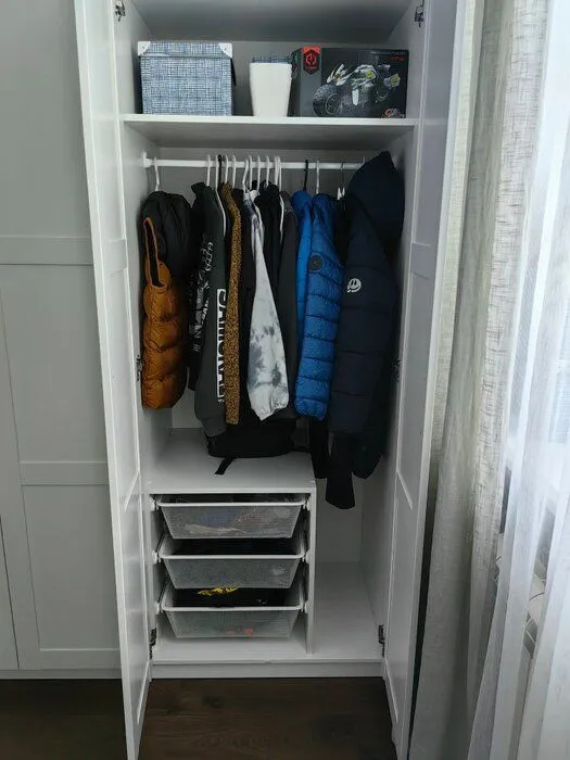 Компактный, отличная цена. Хороший и удобный шкаф за свои деньги. Хотелось бы еще полочку внизу. Выручил органайзер на липучках