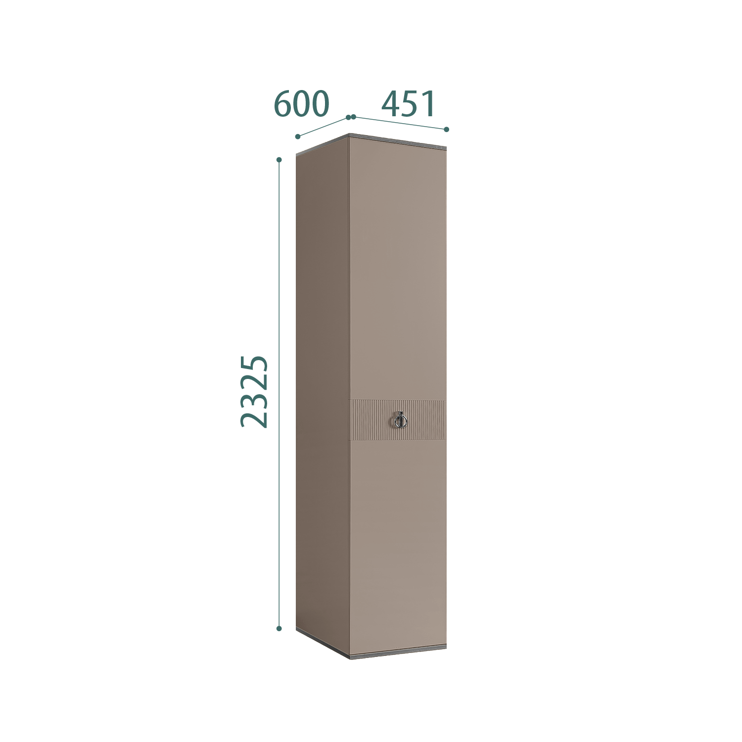 Узкий шкаф Rimini Solo с одной дверцей имеет высоту 232 см и ширину 45 см. Его глубина составляет 60 см, такая модель подходит для небольших гостиных и прихожих, выполненных в современном стиле и арт-деко. Лакированная поверхность шкафа в комбинации с эффектным оттенком приобретает праздничный вид и проецирует свою красоту в интерьеры.
