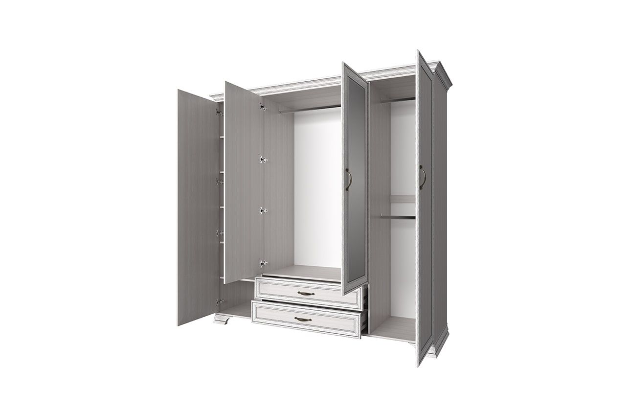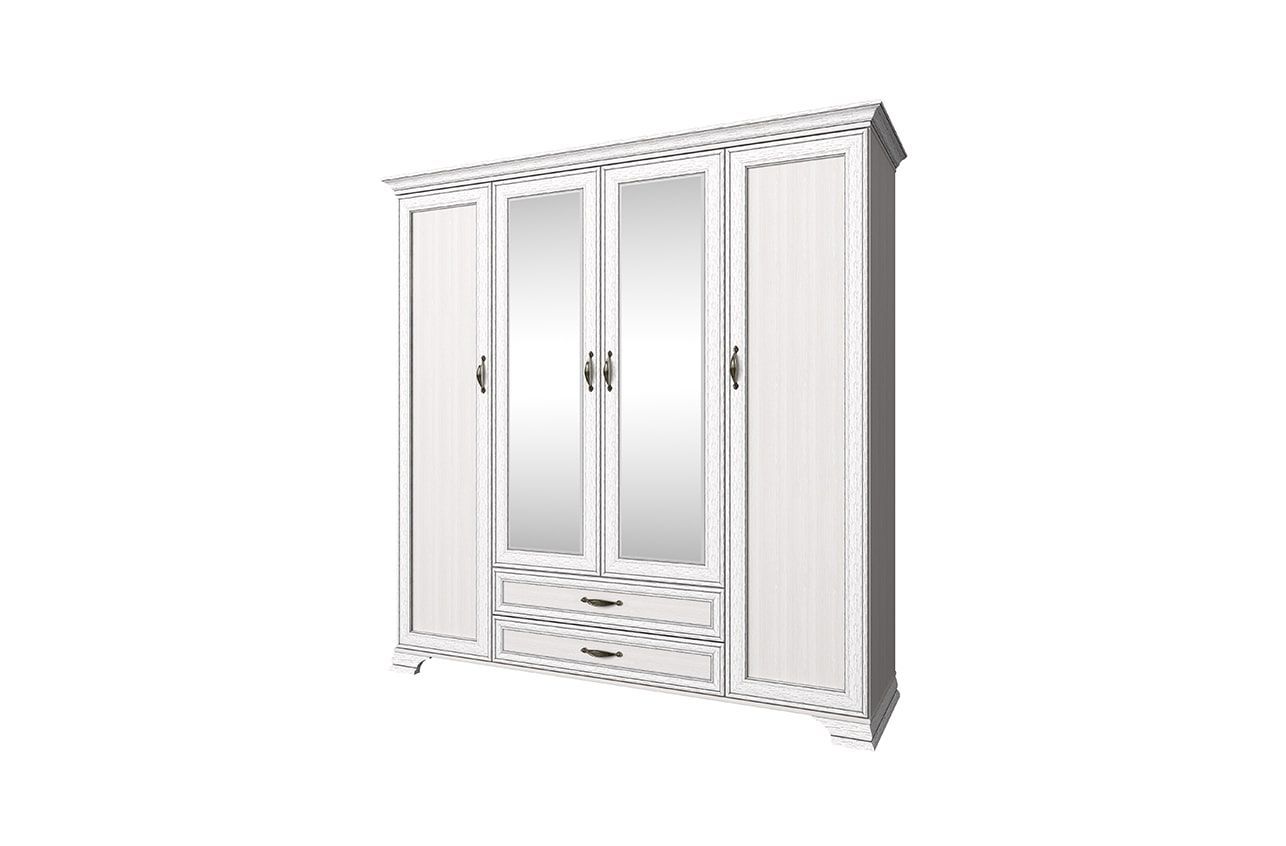 Четырехстворчатый шкаф Tiffany 4D2SZ – это многофункциональная модель с зеркалом и двумя ящиками. В центре расположено просторное платяное отделение, с правой стороны находится отсек для белья с пятью полками, внизу – глубокие ящики на шариковых направляющих. Эта уютная модель в кремовом цвете создана для спальни и детских комнат белорусским брендом Anrex.