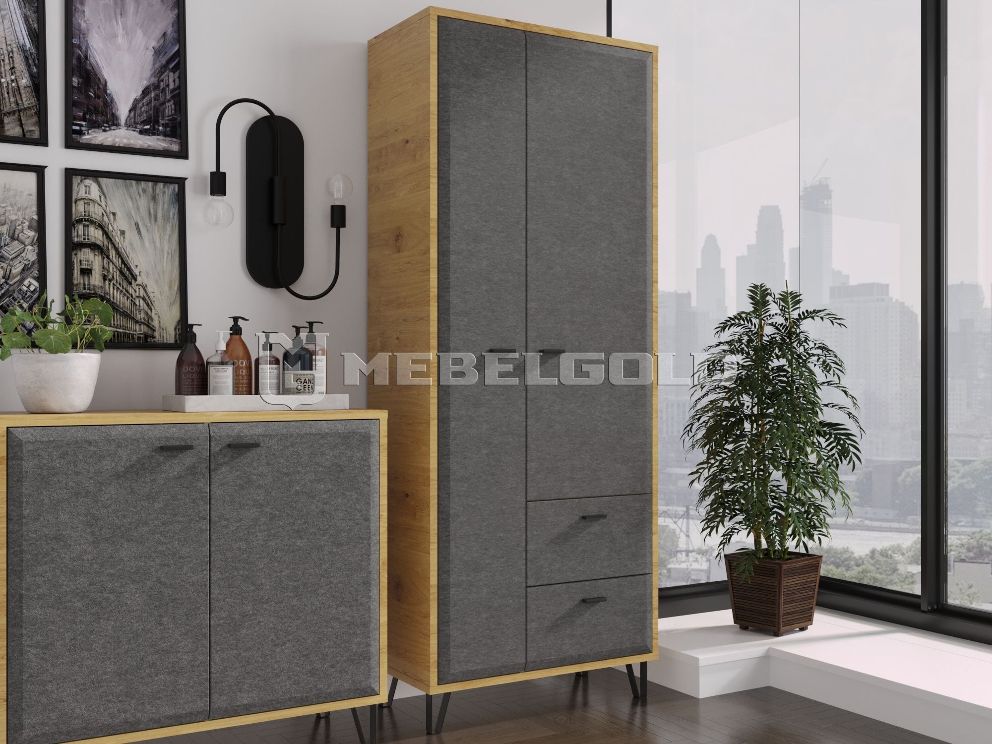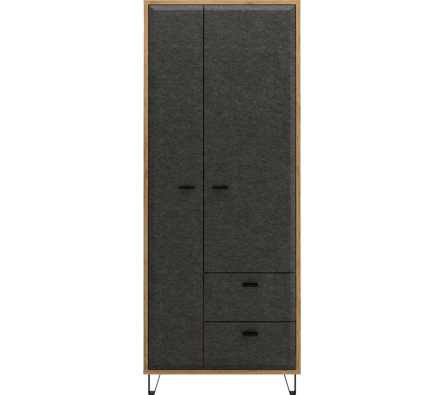 Шкаф Grace с высотой 200 см подойдет помещениям с высокими потолками. Благодаря глубине 41 см и ширине 79 см, а также полкам разного размера, он уместит вещи любого объема. Его фасады, имитирующие древесную структуру дуба, контрастируют с графитовыми дверцами и ящиками. Эта модель шкафа отлично подходит гостиным и рабочим кабинетам, оформленным в современном стиле.