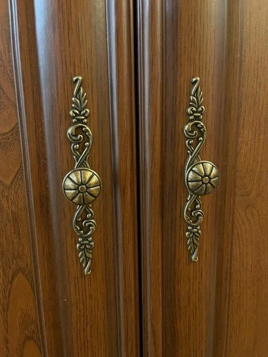 Фасады такой мебели деланы в лучших традициях классики. Они изготовлены из недорогих заменителей древесины (ЛДСП, МДФ), украшены филенками, резным карнизом и патиной под серебро. На фоне белой поверхности она выглядит потрясающе.
