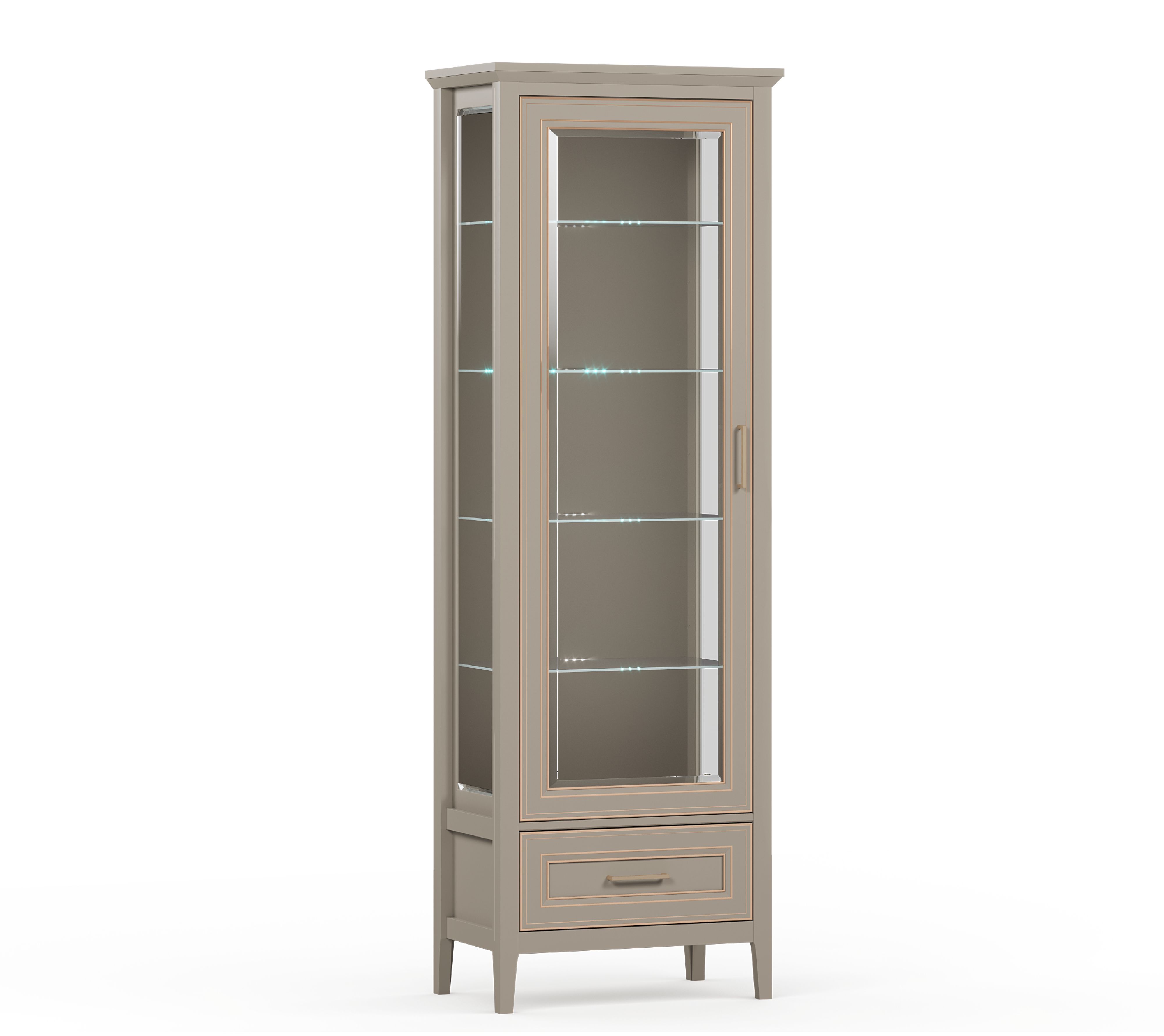 Витрина Classic представлена в виде однодверного шкафа на высоких ножках и с корпусом из ЛДСП. Внизу установлен выдвижной ящик для хранения мелочевок. В зависимости от специфики интерьера, дверь можно перевешивать на любую сторону.