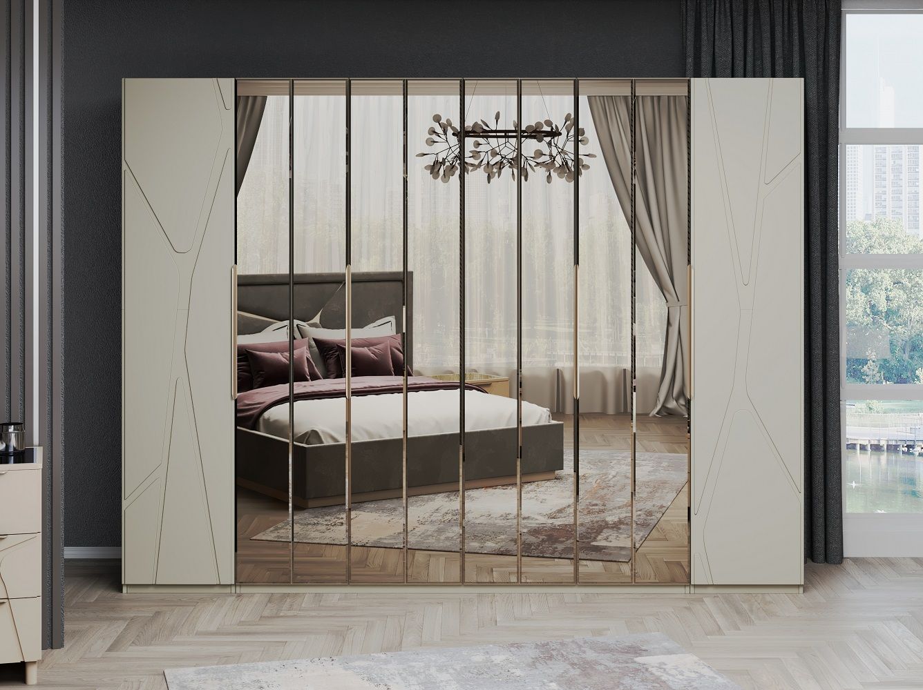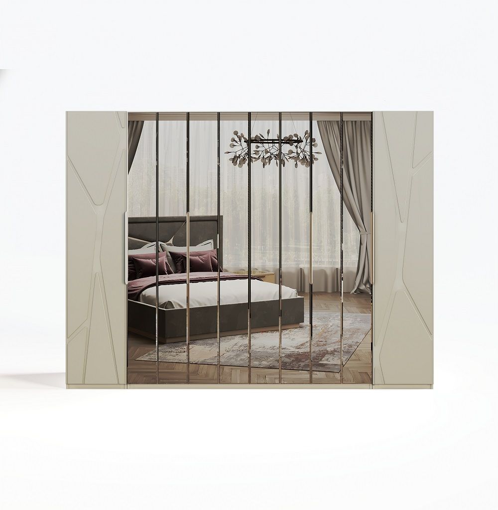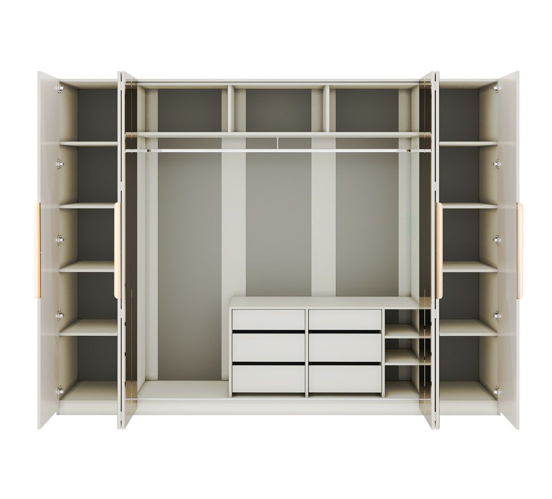 Завершают коллекцию вместительные шкафы "Лейла" которые представлены в 2х размерах — 4х и 6ти дверный.  Складной механизм фасадов экономит место, плавная эргономичная форма ручки рейлинга позволяет удобно пользоваться шкафом, стандартное внутреннее наполнение с 2мя функциональными комодами, полками и штангой сохранят ваши вещи в порядке .