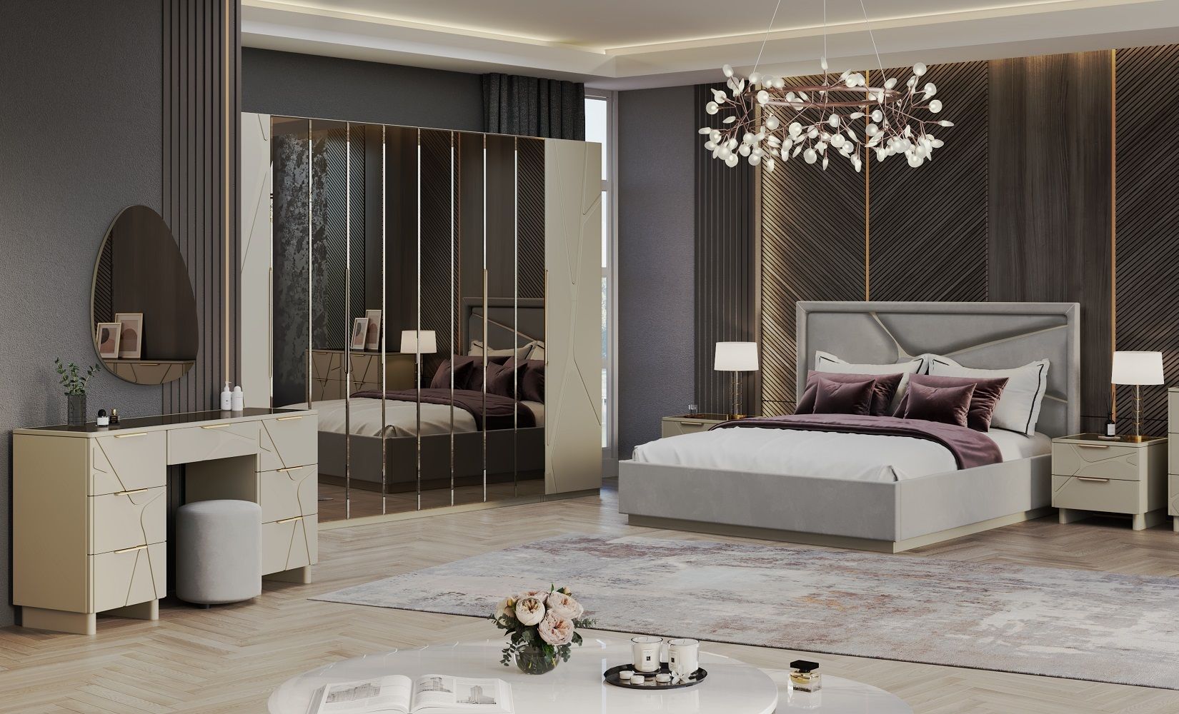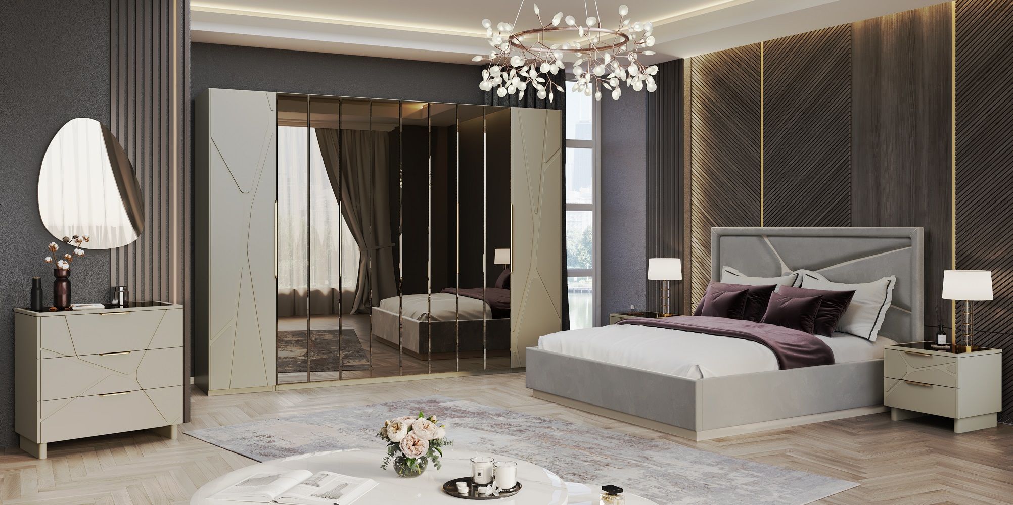 Каждая деталь спальни тщательно продумана, чтобы подарить вам не только максимальный комфорт и эстетическое удовольствие, но и уверенность в высоком качестве мебели. Корпуса и столешницы модулей выполнены из ламинированной древесной плиты европейского качества, Фасады из природного МДФ задекорированы рельефной фрезеровкой и авторский стиль фабрики ЭРА — это финишное покрытие матовая итальянская эмаль ярко серого цвета.