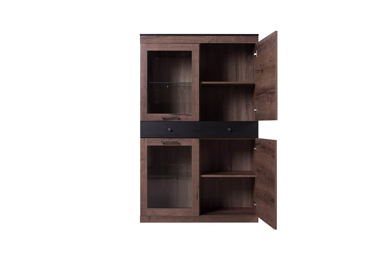 В центре шкафа с витриной Jagger установлен черный выдвижной ящик с круглыми металлическими ручками, что придает ему выразительность и стильный вид. Такую мебель можно с уверенностью устанавливать в комнатах, оформленных в стиле модерн, минимализм и хай-тек. Дверцы легко перевешиваются на левую или правую сторону, а при необходимости – дополняются LED подсветкой. Шкаф с витриной «Джаггер» является вместительной моделью с шириной 100 см, высотой 159 см и глубиной 35 см.