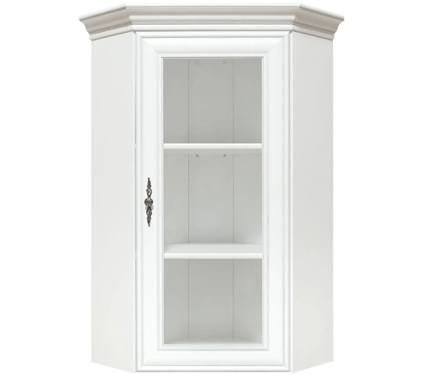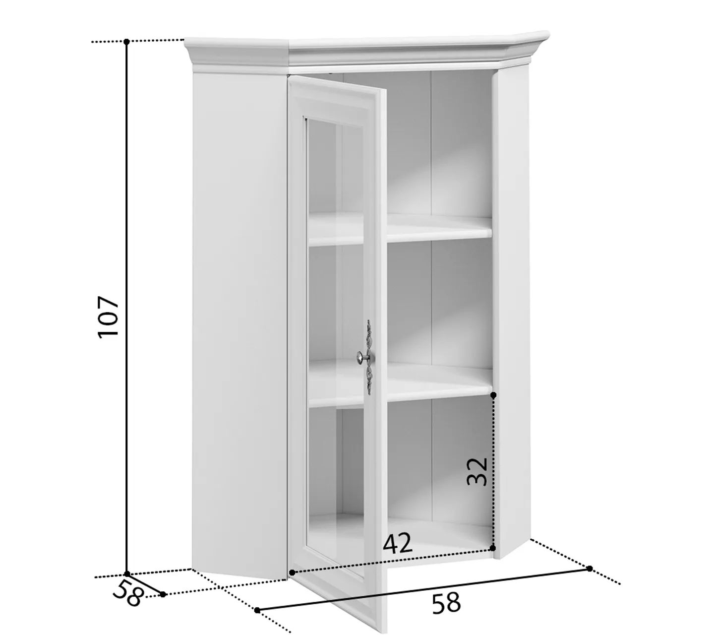 Белая угловая витрина Kentaki – это компактная и одновременно вместительная конструкция высотой 107 см, шириной 58 см и аналогичной глубиной. На фасаде расположено прозрачное закаленное стекло, которое создает хороший обзор и обеспечивает полную безопасность при использовании. На ее полках легко умещаются книги, посуда, изысканные сервизы и дорогой алкоголь, а сама конструкция органично вписывается в интерьер спальни, комнаты для приема гостей и любого другого помещения.