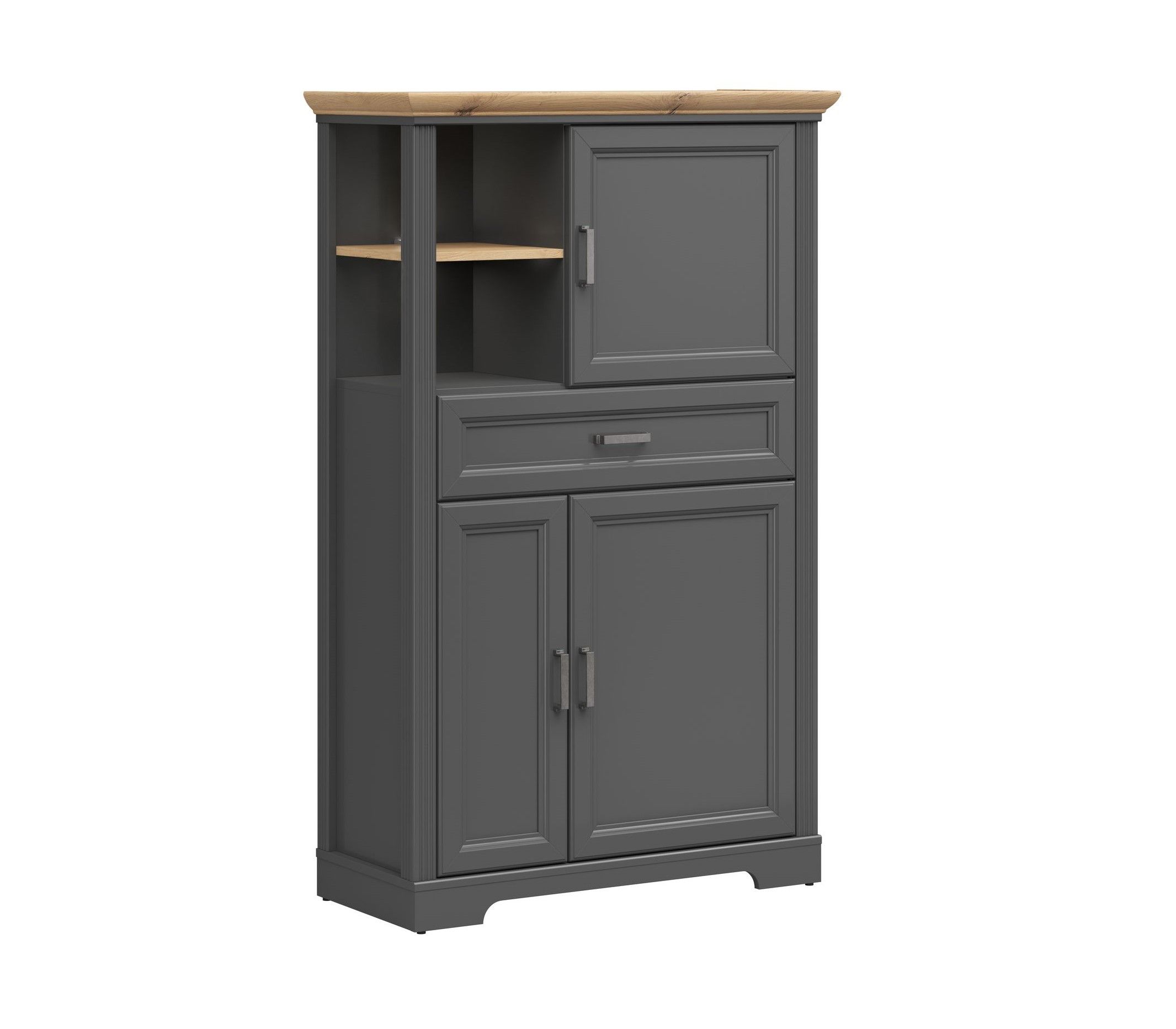 Шкаф Jasmin REG3D1S из ЛДСП класса Е1 и МДФ гарантирует безопасное пользование, а установленные петли с доводчиками – комфортную эксплуатацию. Эта модель продумана строго до мелочей. Его открытые полки идеально предназначены для хранения посуды и коллекционных вещей. За глухими дверями можно разложить домашнюю атрибутику – все то, что не должно пылиться и попадать под действие солнца.