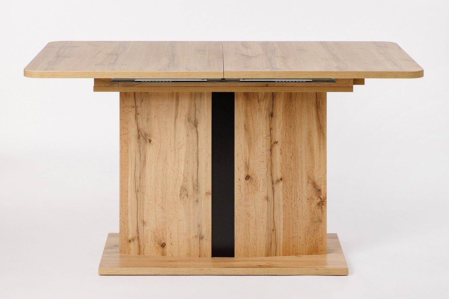 Увеличение длины столешницы осуществляется при помощи синхронного механизма "Poettker", оснащенного стопорами. Массивная нога-опора базируется на прочном основании, устойчивом за счет большой площади.