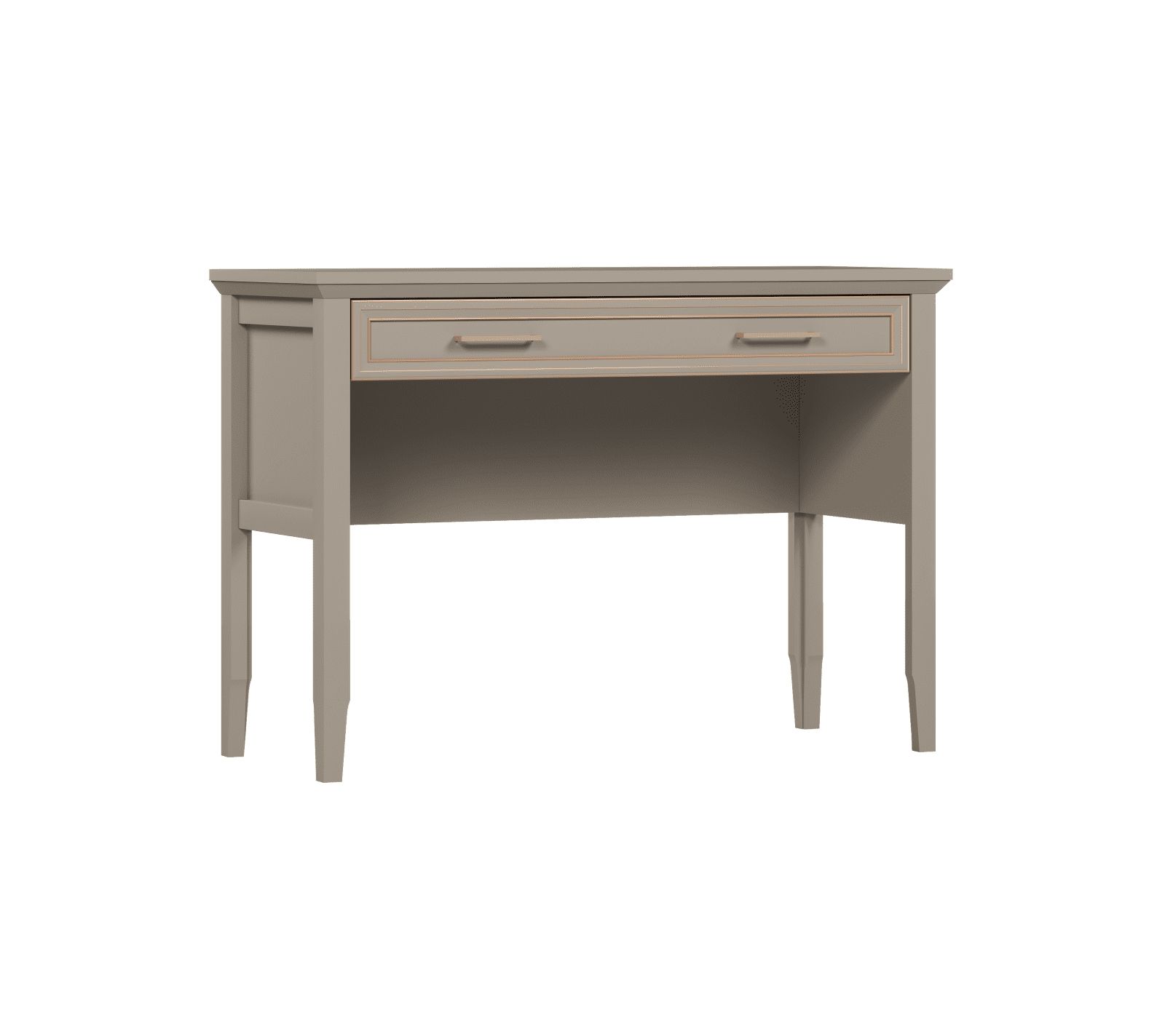 Туалетный стол коллекции Classic – разработка белорусского бренда БРВ-мебель. Он представлен простой конструкцией на четырех конусообразных ножках. Модель оформлена в классических традициях и сочетает простоту с элегантностью. Такой столик привлекает незамысловатым дизайном и глиняно-серым цветом с бесконечными теплыми нотками. Ярким и выразительным он становится благодаря золотистой окантовке, украшающей ящик по всему периметру.