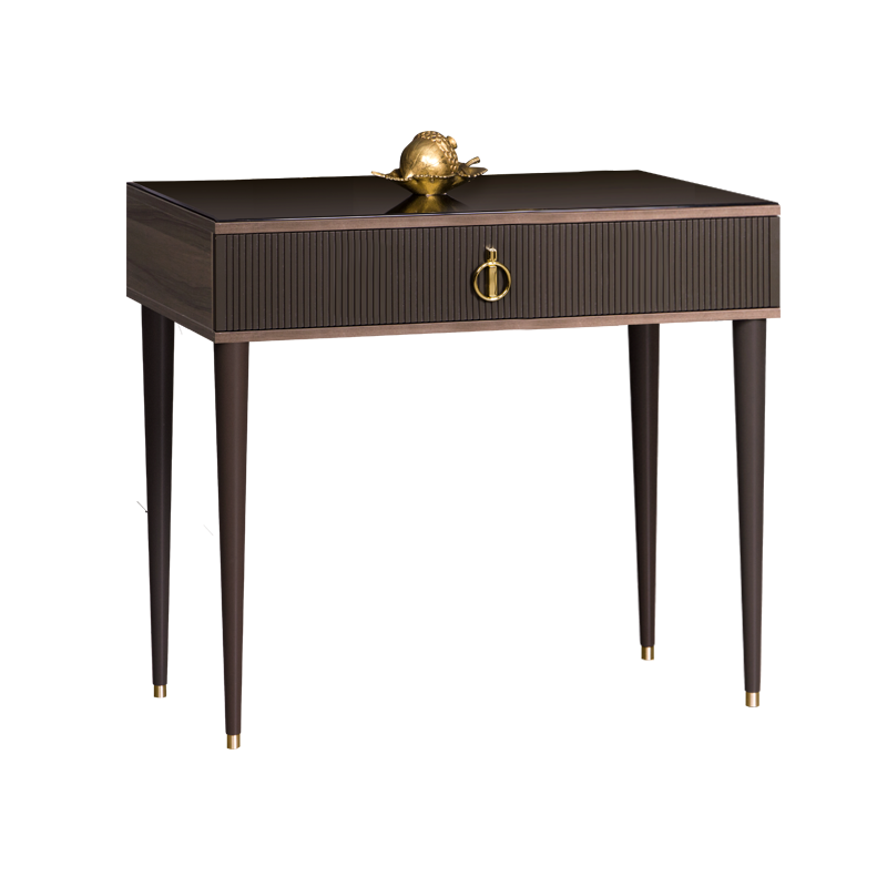 Узкий туалетный стол Rimini Solo – образец итальянского дизайна и европейского комфорта. По внешнему виду он напоминает консоль с изящными конусообразными ножками, дополненными латунными наконечниками. Идеальная симметрия, сдержанная цветовая гамма, акцентные вставки под золото или серебро – не единственные особенности столика «Римини Соло». В тон этим элементам здесь подобраны итальянские руки, а в ящике установлены направляющие с доводчиками.