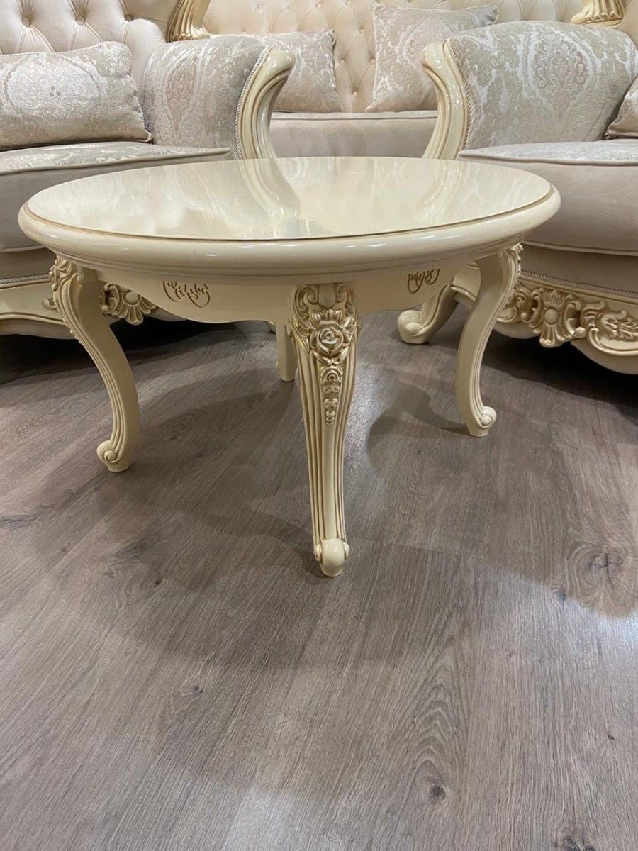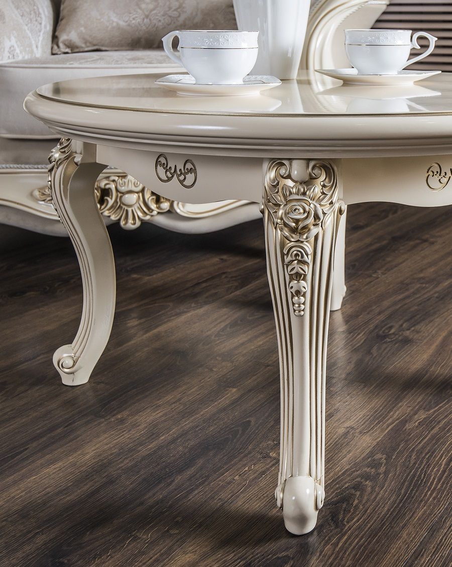 Круглый журнальный столик «Джоконда» с толщиной столешницы 60 мм изготовлен на мебельной фабрике «Эра» из цельнокроенного МДФ и ЛДСП категории Е1. Накладной декор в виде завитков и растительных орнаментов сделан из ППУ, легкого и износостойкого полимера. Столешница равномерно окрашена в 4 слоя экологически безопасной краской в цвете крем и имеет красивый глянцевый блеск.
