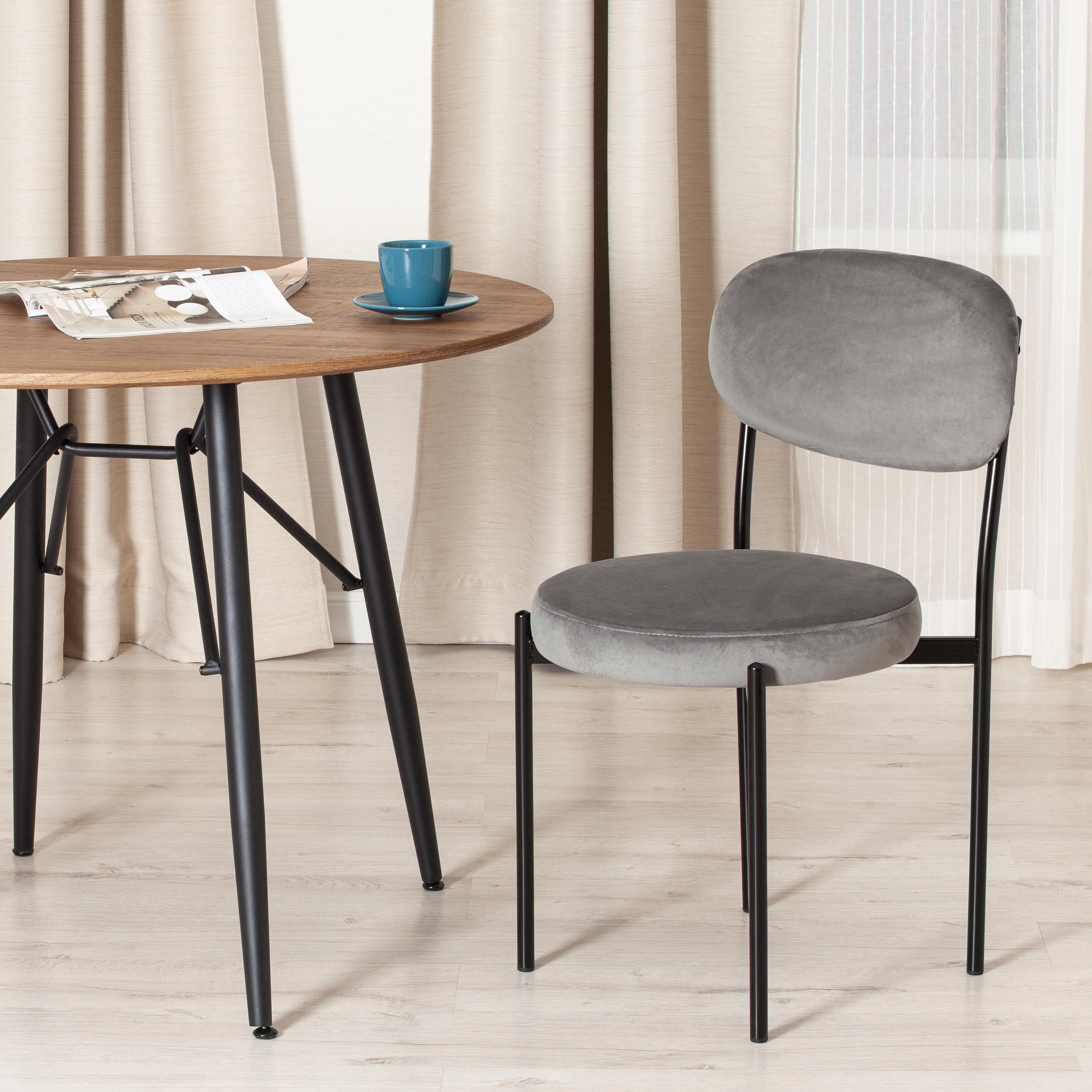 Изящная форма и оригинальный дизайн стула REVO из коллекции Modern позволят привлечь внимание и сделать яркий акцент в вашем интерьере. Принципы лаконичности ярко прослеживаются в дизайне стула. Он прекрасно впишется в обстановку гостиной, кухни, столовой или спальни. Сочетание тонких металлических ножек черного цвета и темно-серой обивки выглядит привлекательно, стильно, современно. Удобное сиденье и спинка позволяют комфортно сидеть продолжительное время. Теплая бархатистая поверхность обивки обеспечит максимальный уют и комфорт. Тканевая обивка обладает повышенной износостойкостью, гипоаллергенна и способна на долгие годы сохранить свой первоначальный цвет, не протираясь и не выцветая. Металлический каркас стула прочен, надежен, основателен. Стул хорошо подойдет для гостиной, для кухни, для спальни, для ресторана или для кафе. Стул очень прост в сборке, инструкция по сборке прилагается.