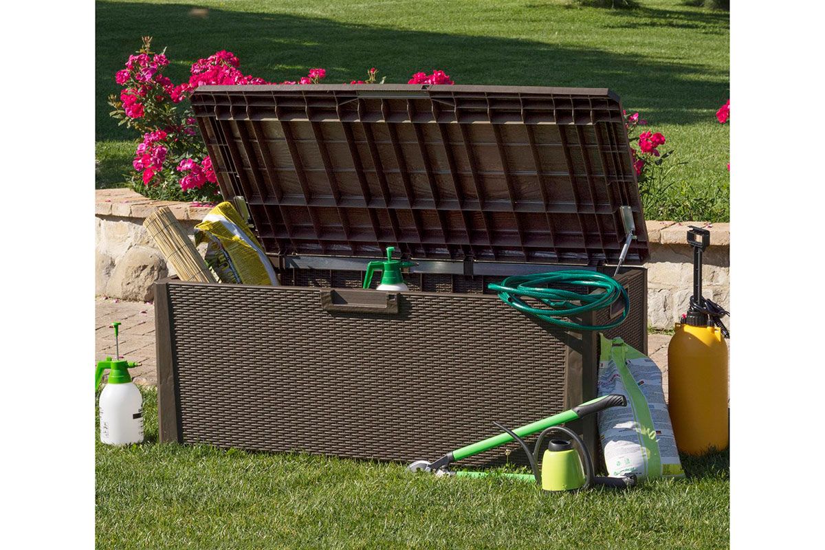 Поможет в организации хранения хозинвентаря на участке загородного дома, спортивного инвентаря, подушек для садовой мебели, вещей во влажном помещении, дома, на балконе или возле бассейна.