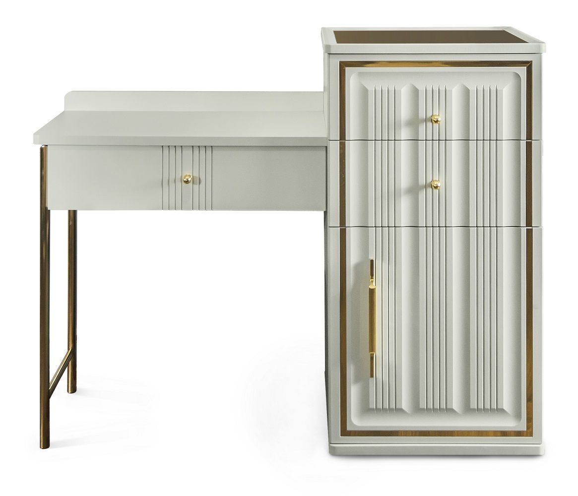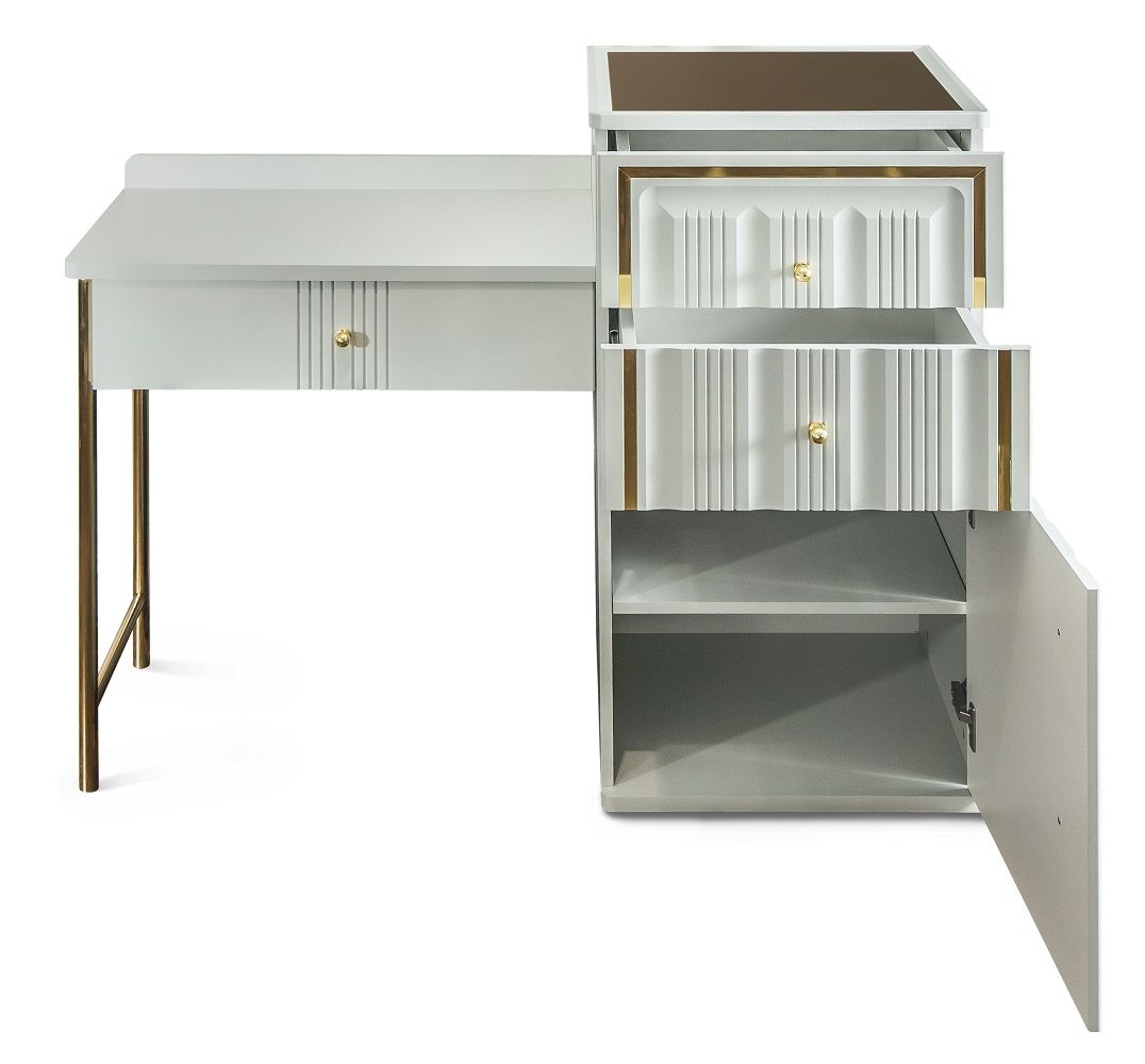метализированный декор и фактурная фрезеровка на фасадах — авторский стиль Эра оригинальные металлические опоры в цвете латунь  - облегчают пространство и добавляют возможность использовать современные гаджеты -  уборка с помощью робота пылесоса