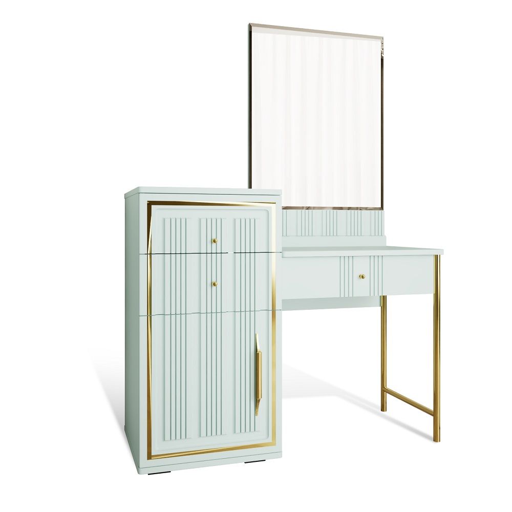 Прикроватные тумбочки с эффектом парения, туалетный стол на лёгких металлических опорах с топами из крашеного итальянской эмалью МДФ с модным декором стеклянной бронзированной поверхностью выгодно подчеркнут стиль спальни. Спальня оснащена современными европейскими механизмами с доводчиками.