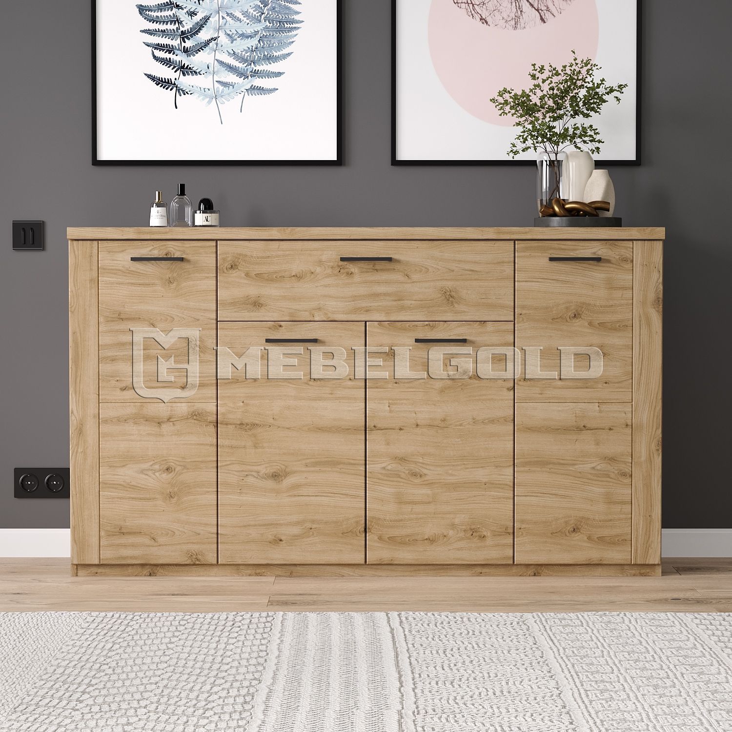 Тумба Doorset 4D1S шириной 160 и глубиной 41 см с легкостью заменит небольшой шкаф и уютно разместится вдоль стены. Своим простым, незамысловатым дизайном она не утяжелит интерьер и впишется в любое пространство. При изготовлении тумбочки используется ламинированная плита ДСП и МДФ в цвете дуб наварро. Такое покрытие легко очищается от загрязнений и не притягивает пыль.