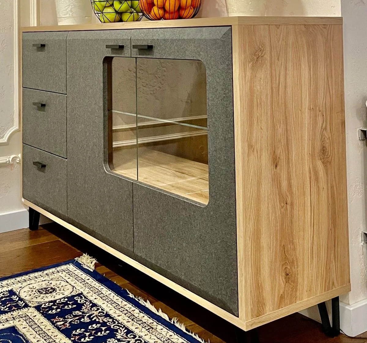 Комод соответствует фото и описанию продавца! Отличный, для кухни-гостиной! Необычный дизайн. Подсветка. Качество на высоте. Сборка от продавца. Проблем не возникло. Рекомендую.