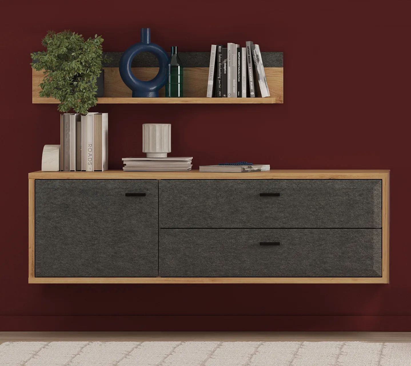 Навесная белорусская тумба Grace шириной 135 см и высотой 41 см компактно разместится на стене и станет прекрасной альтернативой ТВ-тумбе. Эта модель имеет горизонтальное расположение, два ящика и дверцу с полкой внутри. Ее поверхность в древесных тонах, оттененная графитовыми фасадами и черными прямыми ручками, гармонично вписывается в современные интерьеры.