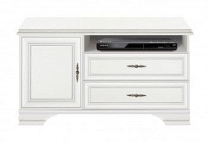С ее помощью зону ТВ можно сделать еще более функциональной. Белая тумба под телевизор Kentaki производства Белоруссии – образец эргономики и продуманного наполнения. Эта напольная конструкция содержит два выдвижных ящика, открытое отделение с отверстиями под ТВ кабель и распашную дверцу с полкой внутри.
