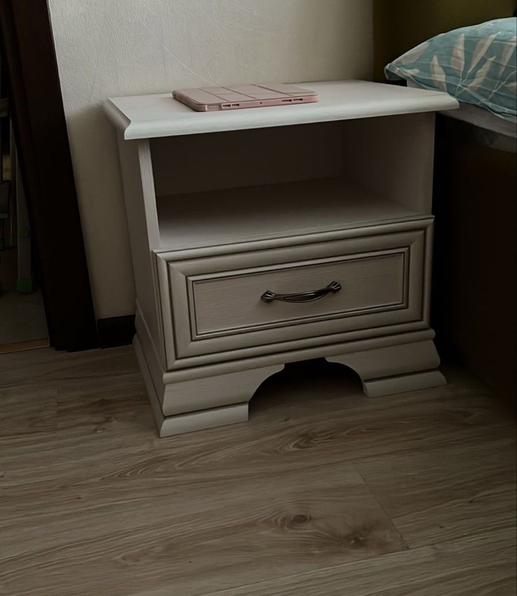 Тумбочку брали к гарнитуру Тиффани специально под цветы. Вписалась хорошо. Сборка простая,инструкция подробная , муж сам собрал за час. Рекомендую.