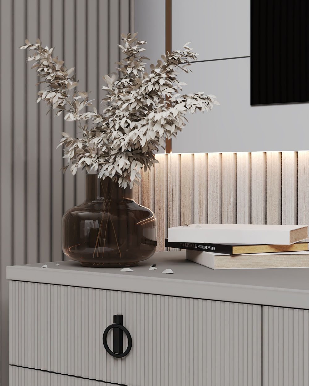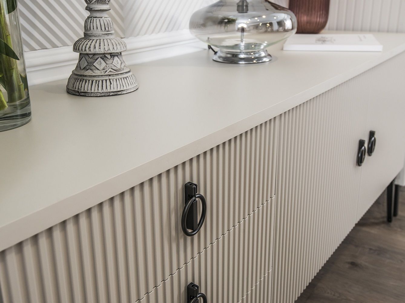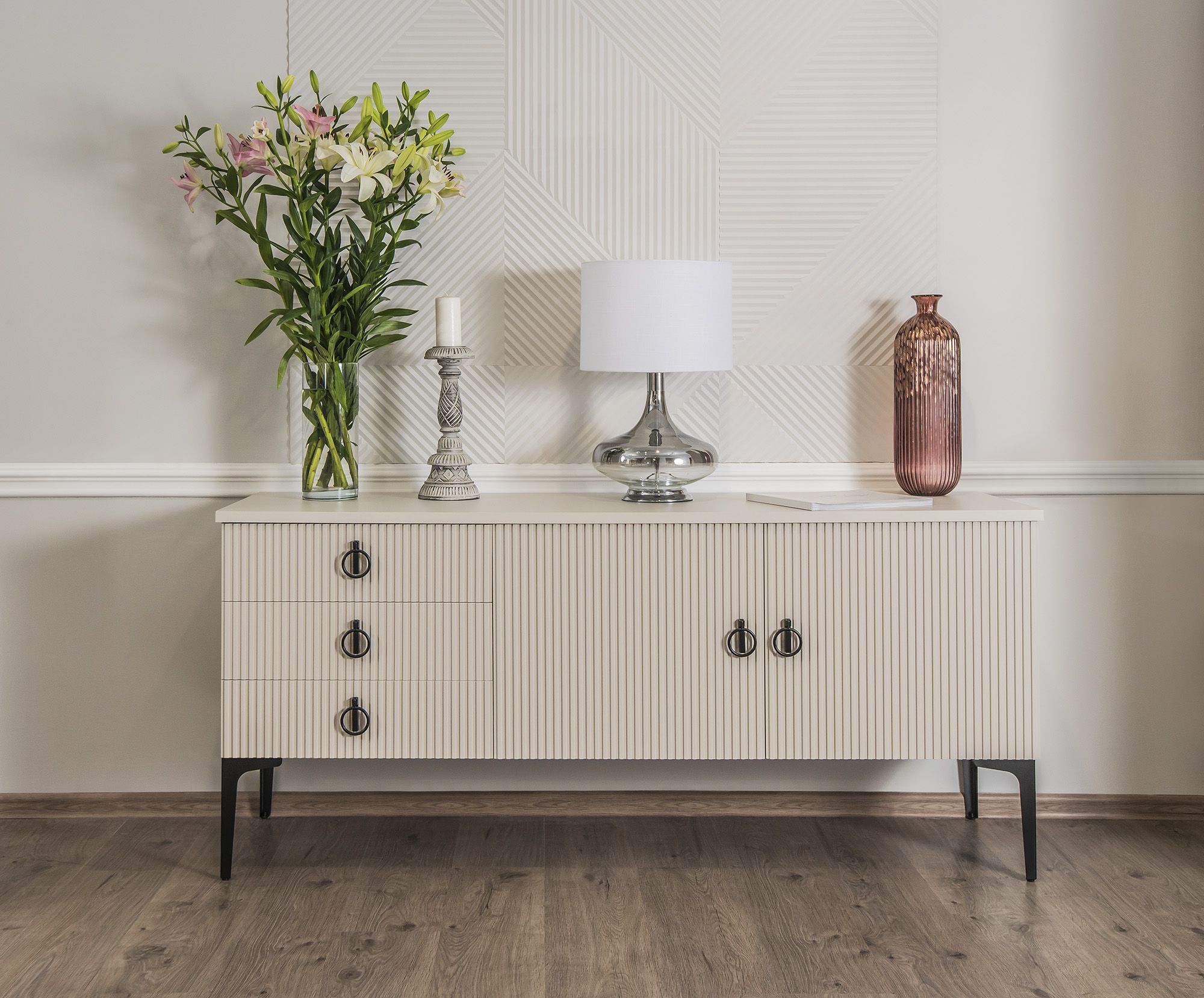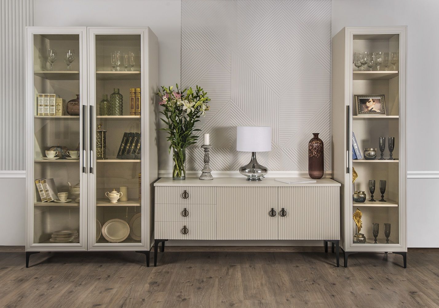 Каждая деталь спальни тщательно продумана, чтобы подарить вам не только максимальный комфорт и эстетическое удовольствие, но и уверенность в высоком качестве мебели. Корпуса и столешницы модулей выполнены из ламинированной древесной плиты европейского качества, Фасады из природного МДФ задекорированы рельефной фрезеровкой и авторский стиль фабрики ЭРА — это финишное покрытие матовая итальянская эмаль ярко серого цвета.