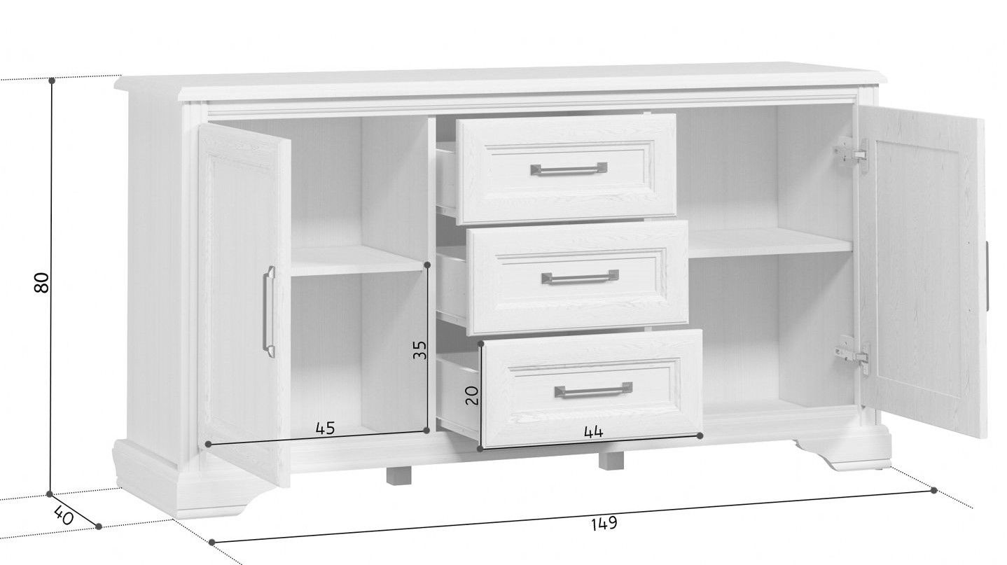 Широкая тумба Stylius высотой 80 см подойдет для хранения белья, игрушек и домашней утвари. Она выдержана в светлых древесных тонах и украшена патиной. Благодаря использованной технике декорирования поверхность тумбочки приобретает красивые узоры в виде темных годовых колец и благородный эффект состаренности. Такая мебель смотрится не хуже премиальных моделей, изготовленных из благородного дерева.