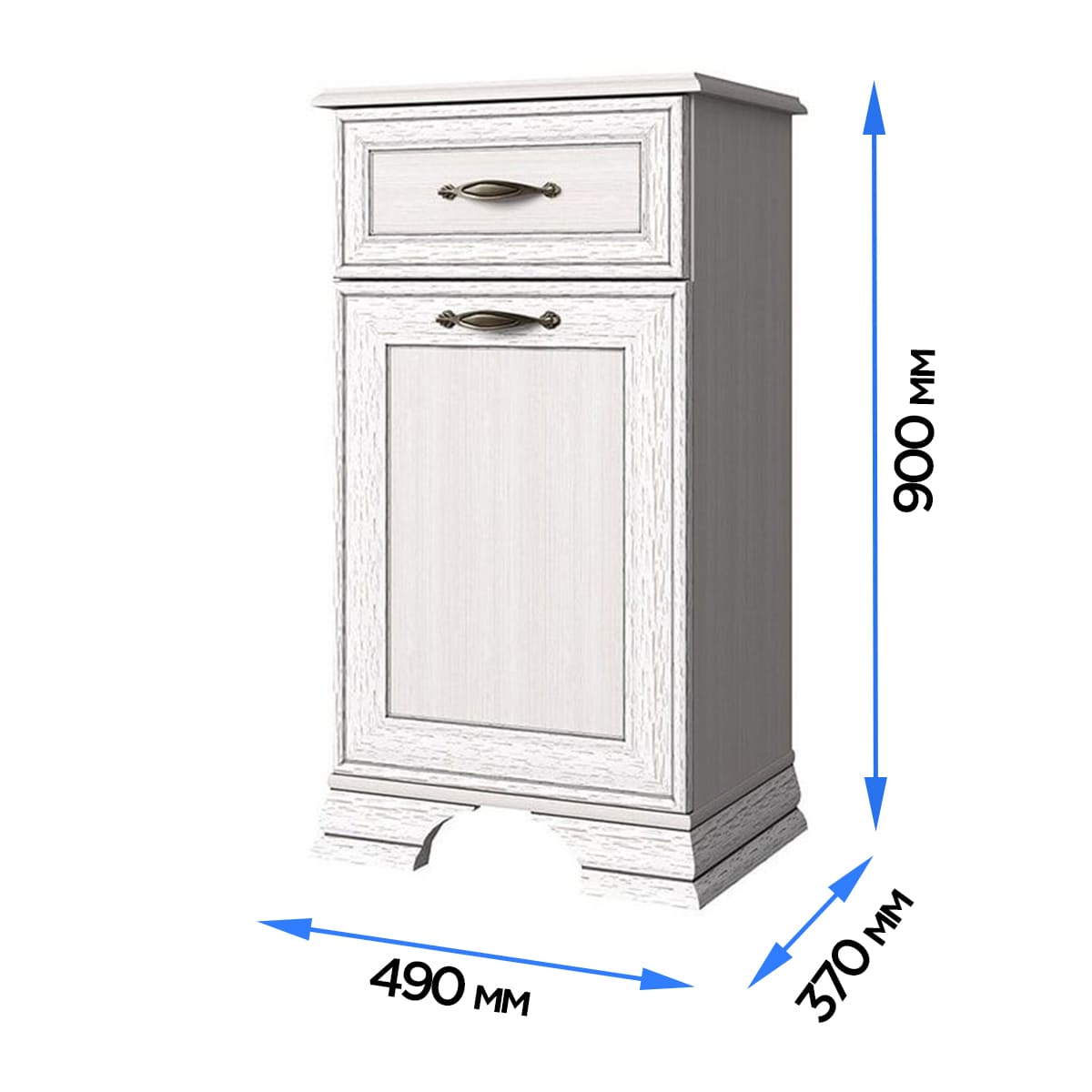 Узкая тумба Tiffany 1D1S оборудована выдвижным ящиком и распашной дверью, за которой спрятана полка. Эта компактная, одностворчатая модель произведена в Белоруссии предприятием Anrex из современных, износостойких материалов (ЛДСП/МДФ). Ее рамочные фасады декорированы филенками и планками с эффектом состаренной древесины. Дверь и ящики украшены изящными ручками-скобами с имитацией потертостей.