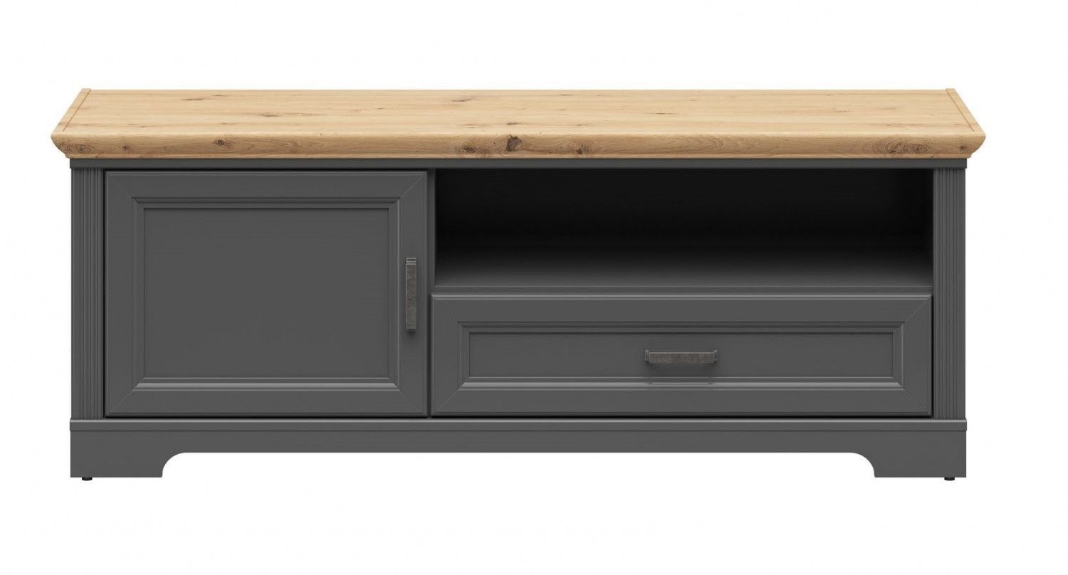 Как и во всей коллекции Jasmin, тумба под телевизор BRW размером 120×67 см сочетает два контрастных оттенка: графит и дуб артизан. Она будто создана из противоречий и гармонично сочетает теплый и холодный цвет с открытыми и закрытыми отделениями. Поистине природное тепло и неординарный вид ей придает акцентная столешница под дерево. За счет филенок и гофрированных вставок модель смотрится выразительно и привлекательно.