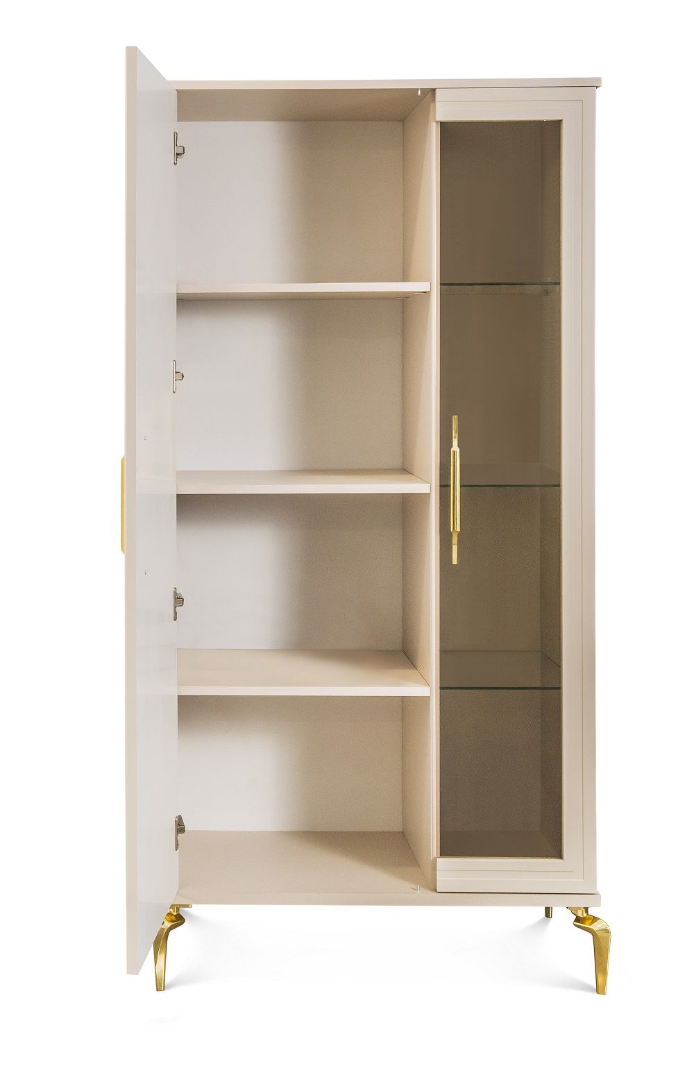 Внутреннее наполнениеШкаф разделен на 2 секции: за щитовой дверью – 4 щитовые полки, за дверью со стеклом – 4 стеклянные полки;