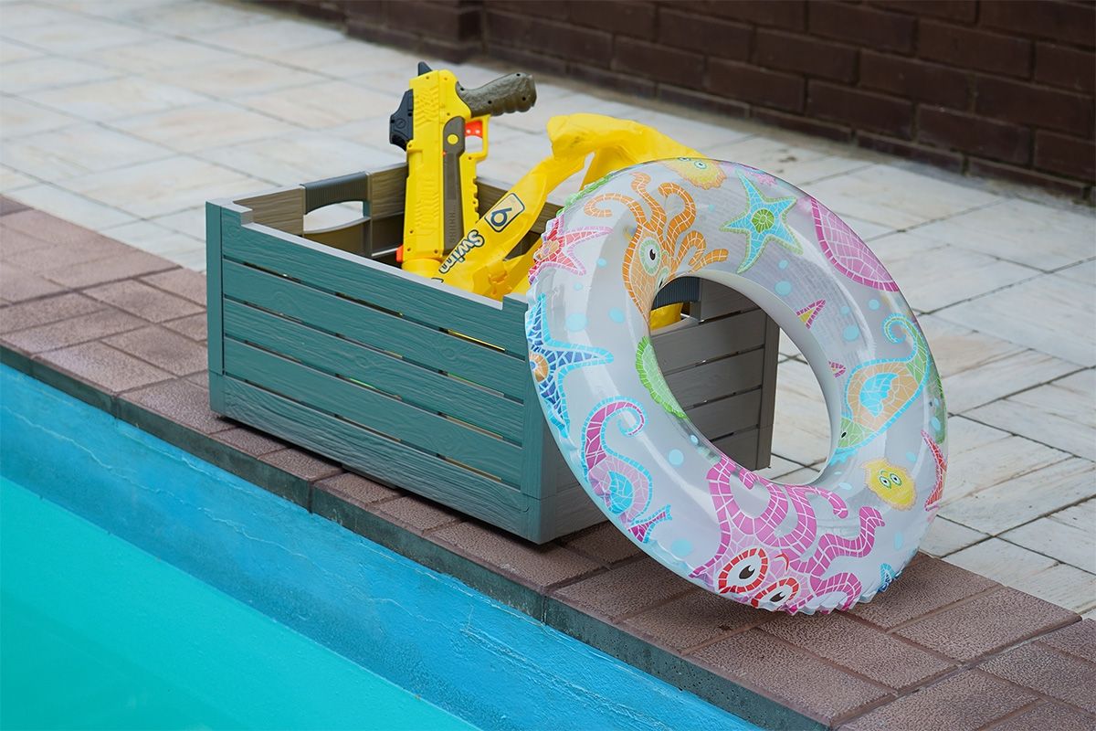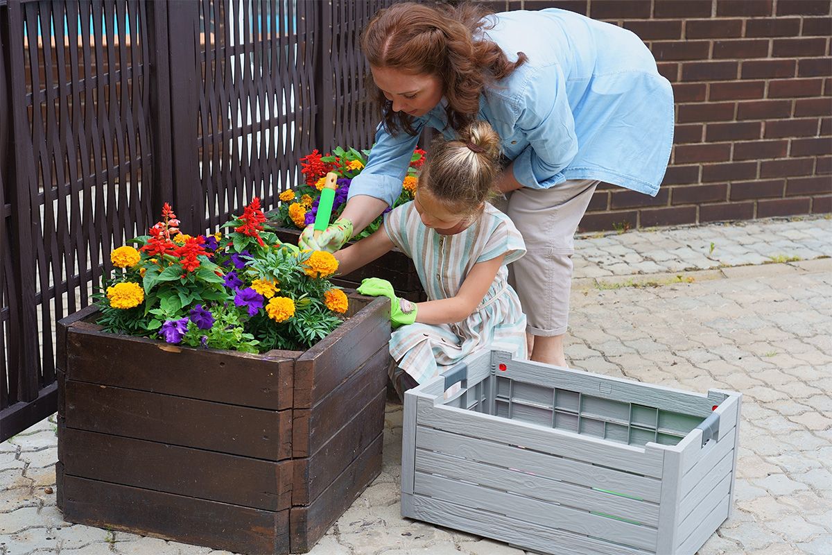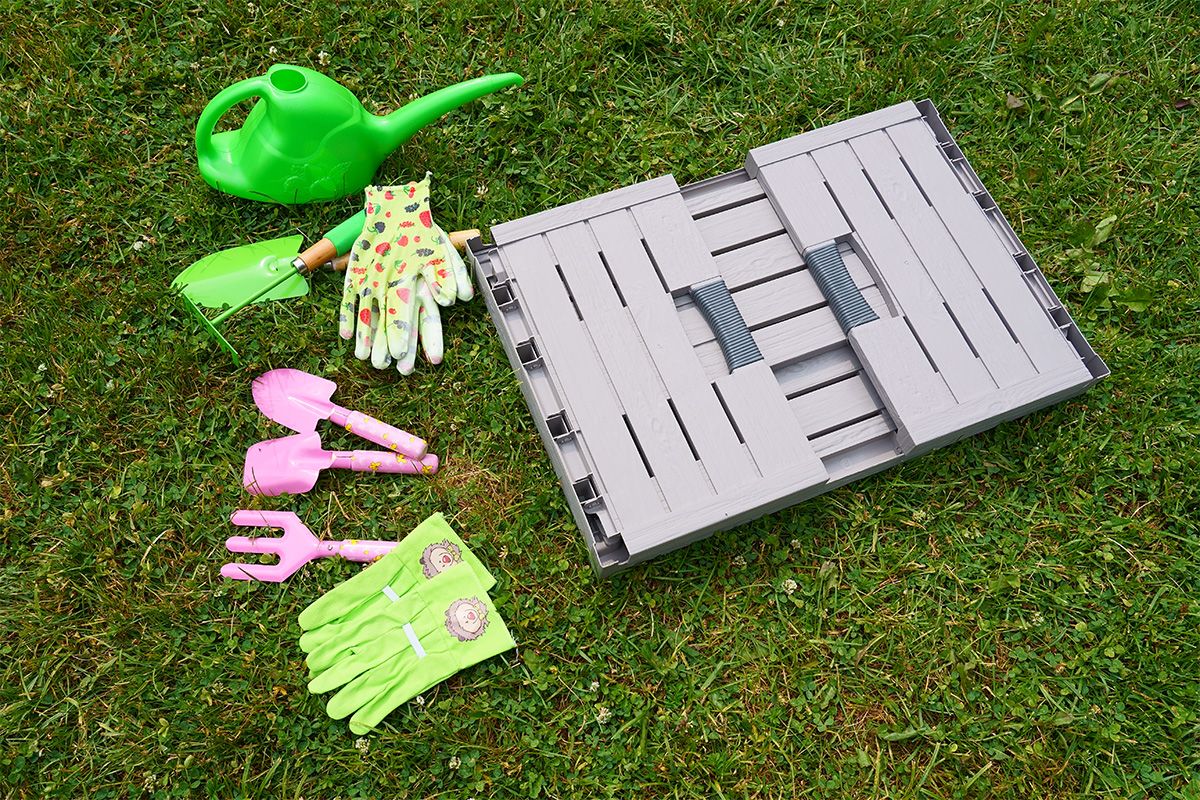 Прочный складной пластиковый ящик для сада с деревянной отделкой, резиновой ручкой и нескользящими ножками.